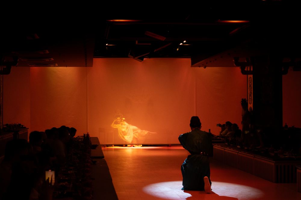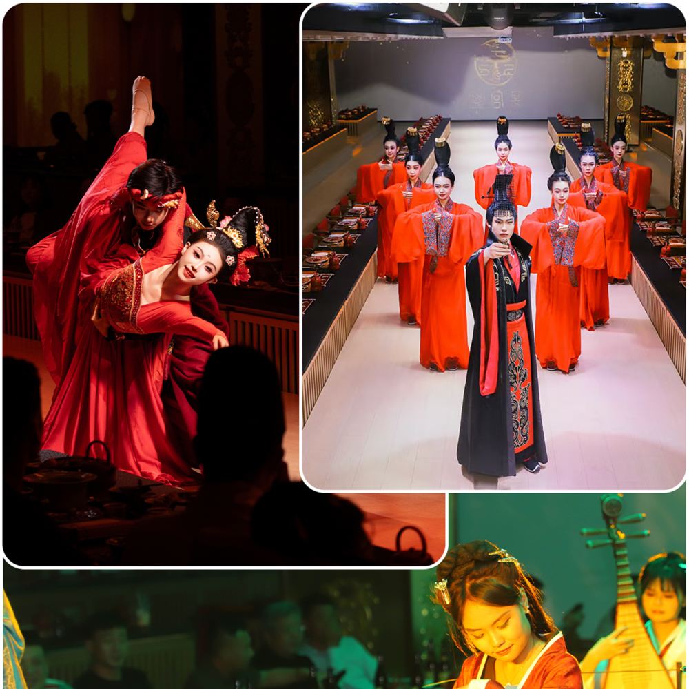 - 宮廷舞秀:舞者身著繡金宮裝,伴隨鼓點跳起「驚鴻舞」,裙擺翻飛如蝶翼,與廳內宮燈、屏風相映,宛如置身古代宮廷。