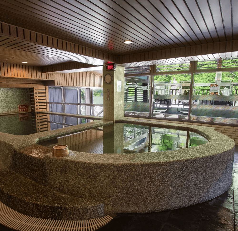 半露天式大眾池可飽覽南勢溪景致,三種溫度湯池、spa水柱池、全檜木烤箱及蒸氣室不限次數使用