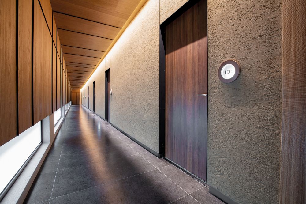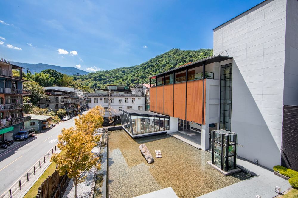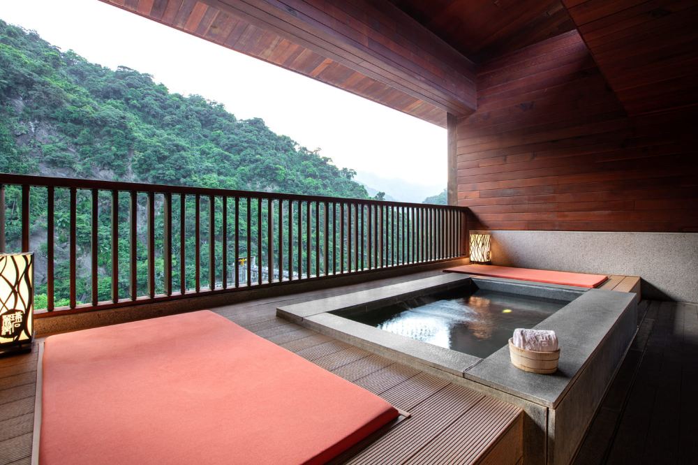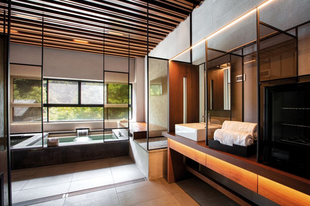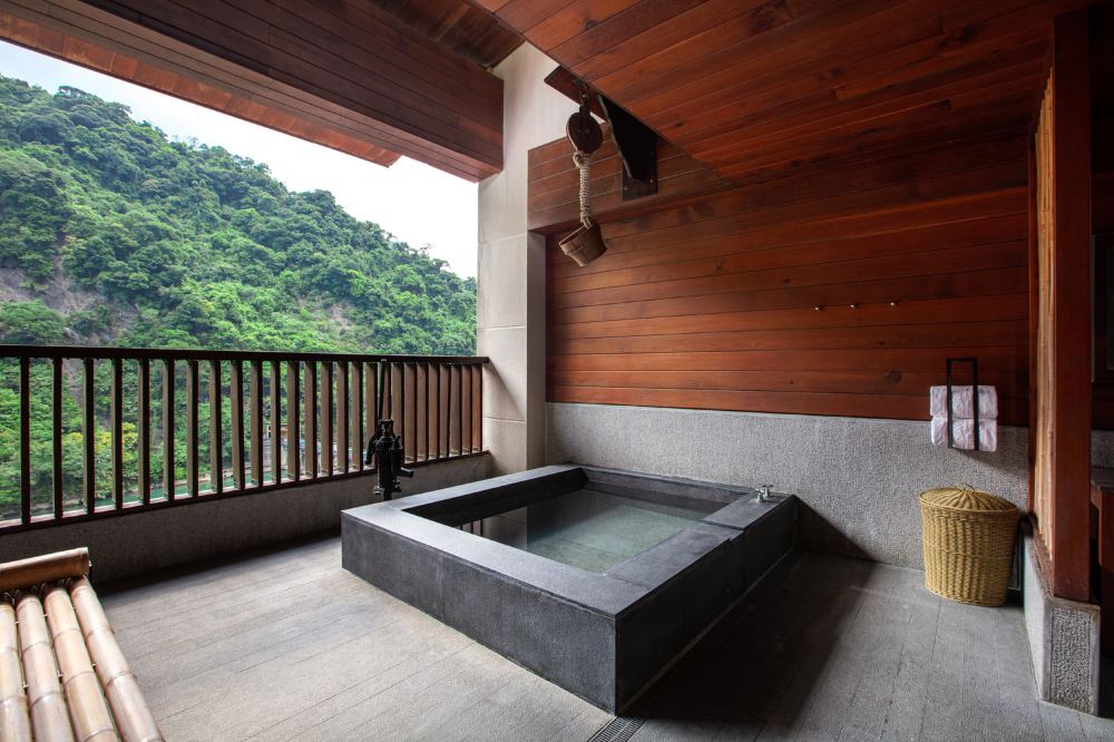 主題湯屋共有六款不同設計,坪數為7-13坪不等,皆為半露天之型式,眺望南勢溪每間均有獨立之衛浴設備;檜木製作之活動柵欄加強隱密性。