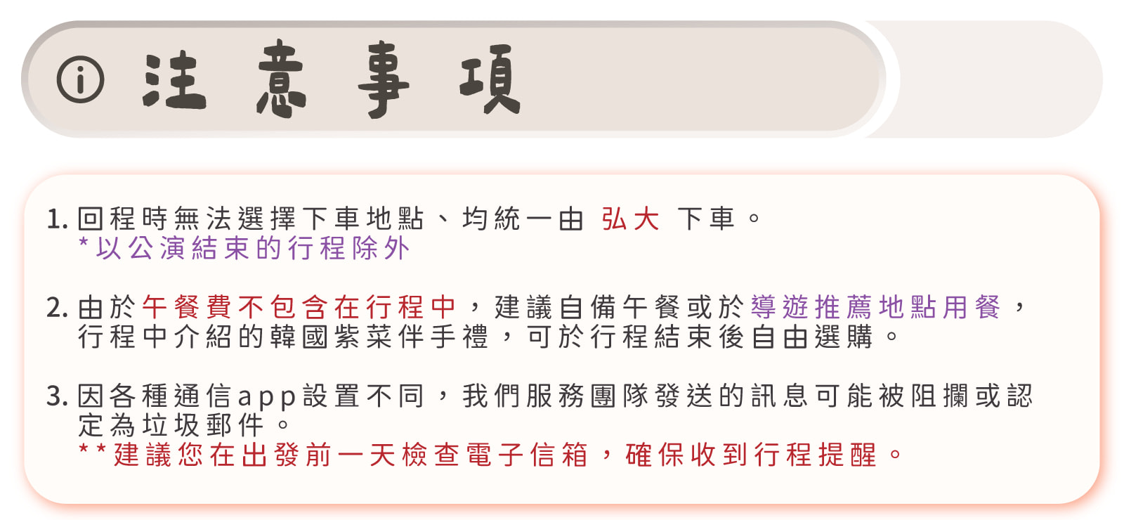 📢 本行程價格不包含午餐。午餐時間導遊會為您推薦餐廳。如有飲食忌口,可能需自帶午餐可於行程結束後購買行程期間試吃的韓國海苔片零食(自願)