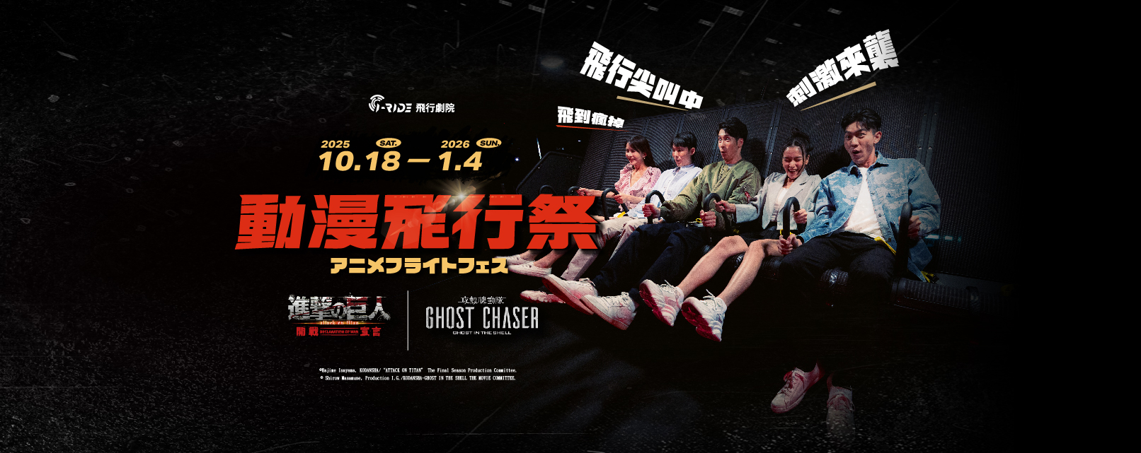 動漫迷引頸期盼的《進擊的巨人》動畫最終章,2023年底已正式完結,這部十年鉅作的結局掀起粉絲們熱烈討論;《進擊的巨人》The Final Season Part1動畫的3D版《進擊的巨人:開戰宣言》,在去年搶先全球登場,推出一個月即破萬人次入場,今年更是將日本富士急樂園同步公開的版本,首度移師來臺放映!讓粉絲能進到飛行劇院體驗,因過程刺激寫實被列為限制級,驚悚的程度絕對值得大家期待。(本體驗為限制級,未滿18歲禁止體驗)