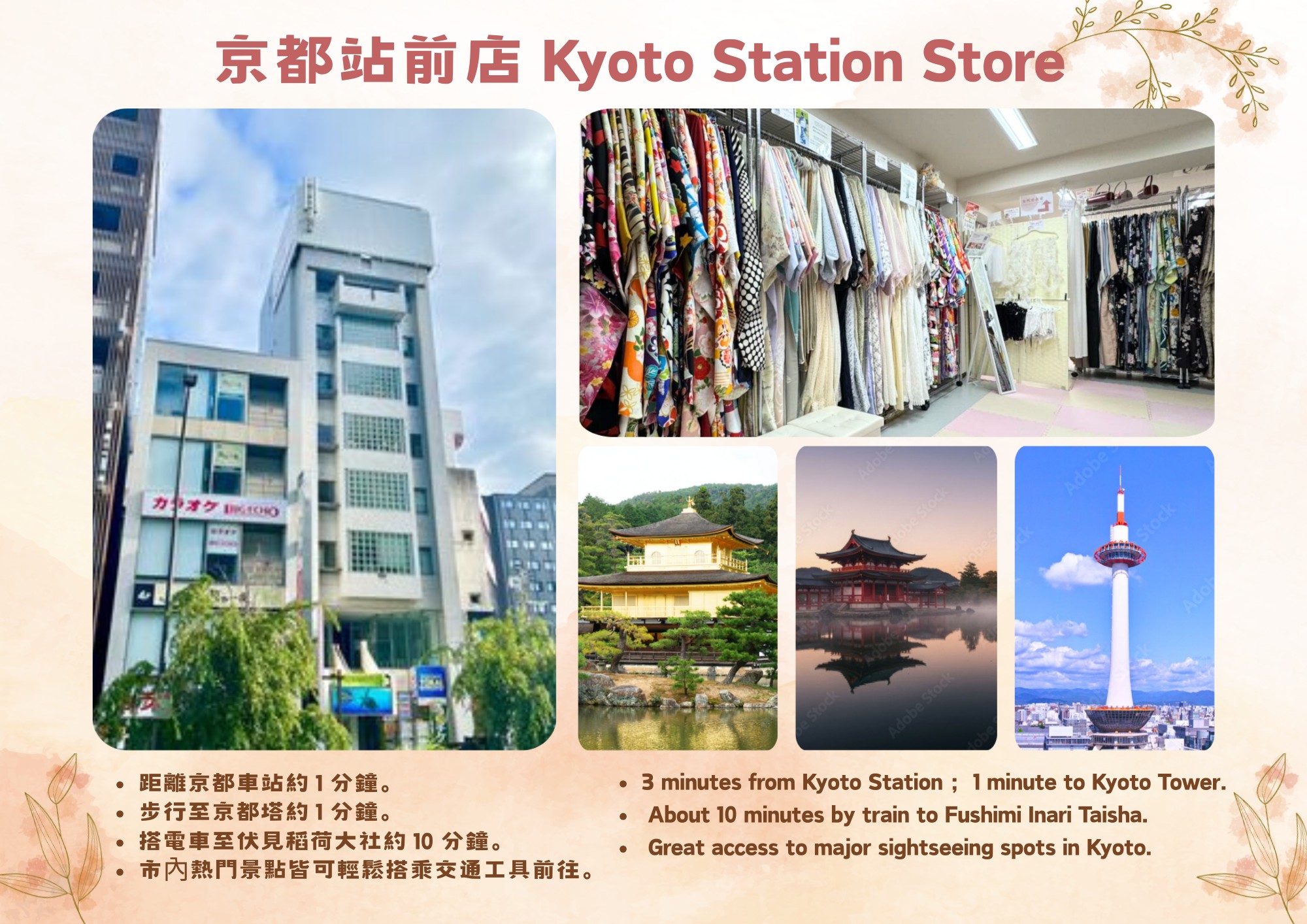 從京都站步行1分鐘。新幹線或巴士抵達後可立即開始觀光。從各式各樣的和服中選擇喜歡的一件,穿好後直接前往嵐山或清水寺等地。觀光後回到店裡換下即可。可以自由享受從短時間到一整天的行程。