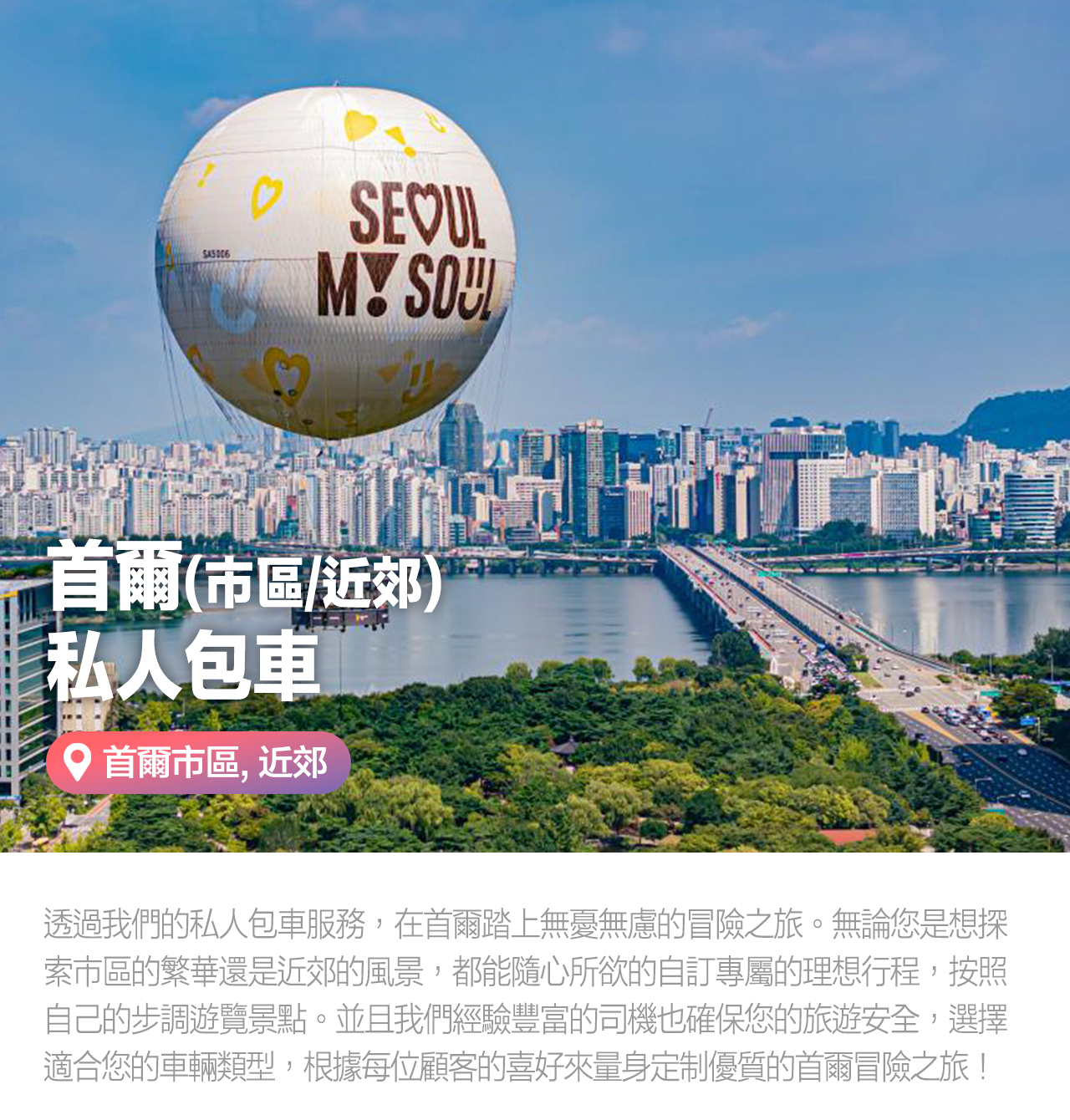 - 預訂專屬包車,每日8或10小時,輕鬆暢遊首爾各大知名景點,免去交通煩惱。客製化你的專屬行程,享受安全又完善的服務