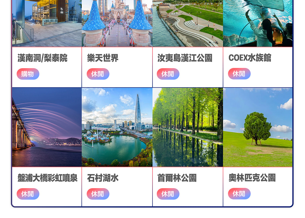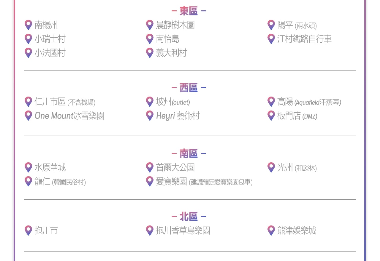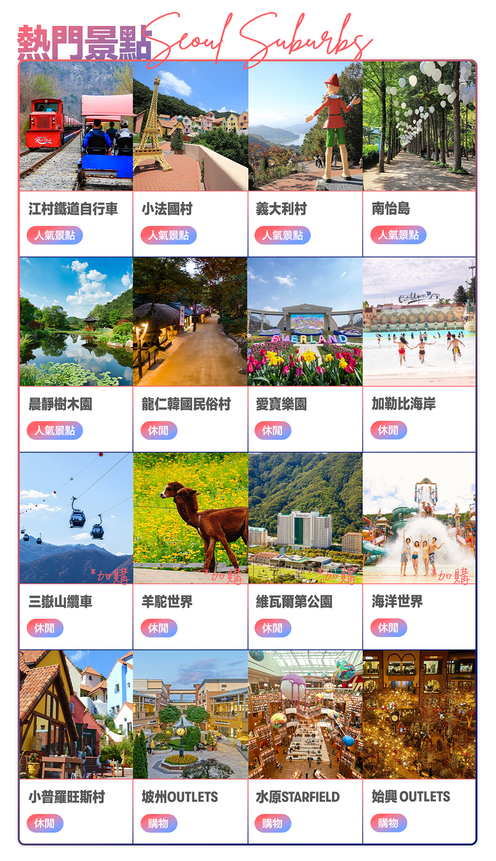 - 自由選擇市區或郊區行程!參考建議路線,輕鬆走訪首爾市區景點,或前往近郊地區,如水原、龍仁市的愛寶樂園、春川市的南怡島、草泥馬樂園、仁川、坡州市等地
