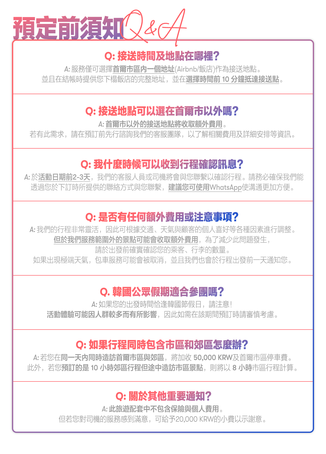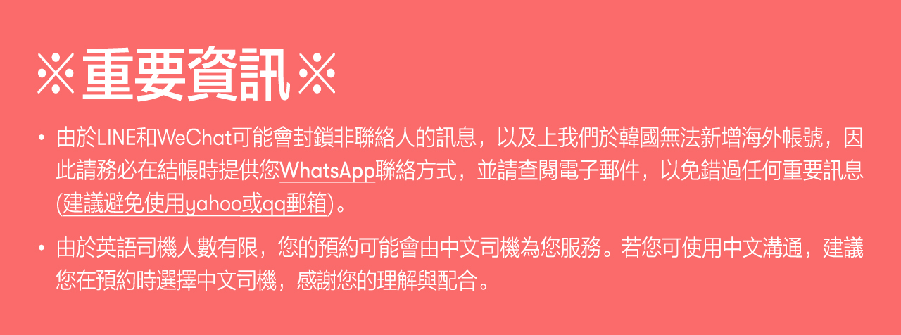 - 接送地點:僅限首爾市內單一地址;若需前往其他地點,請洽詢客服