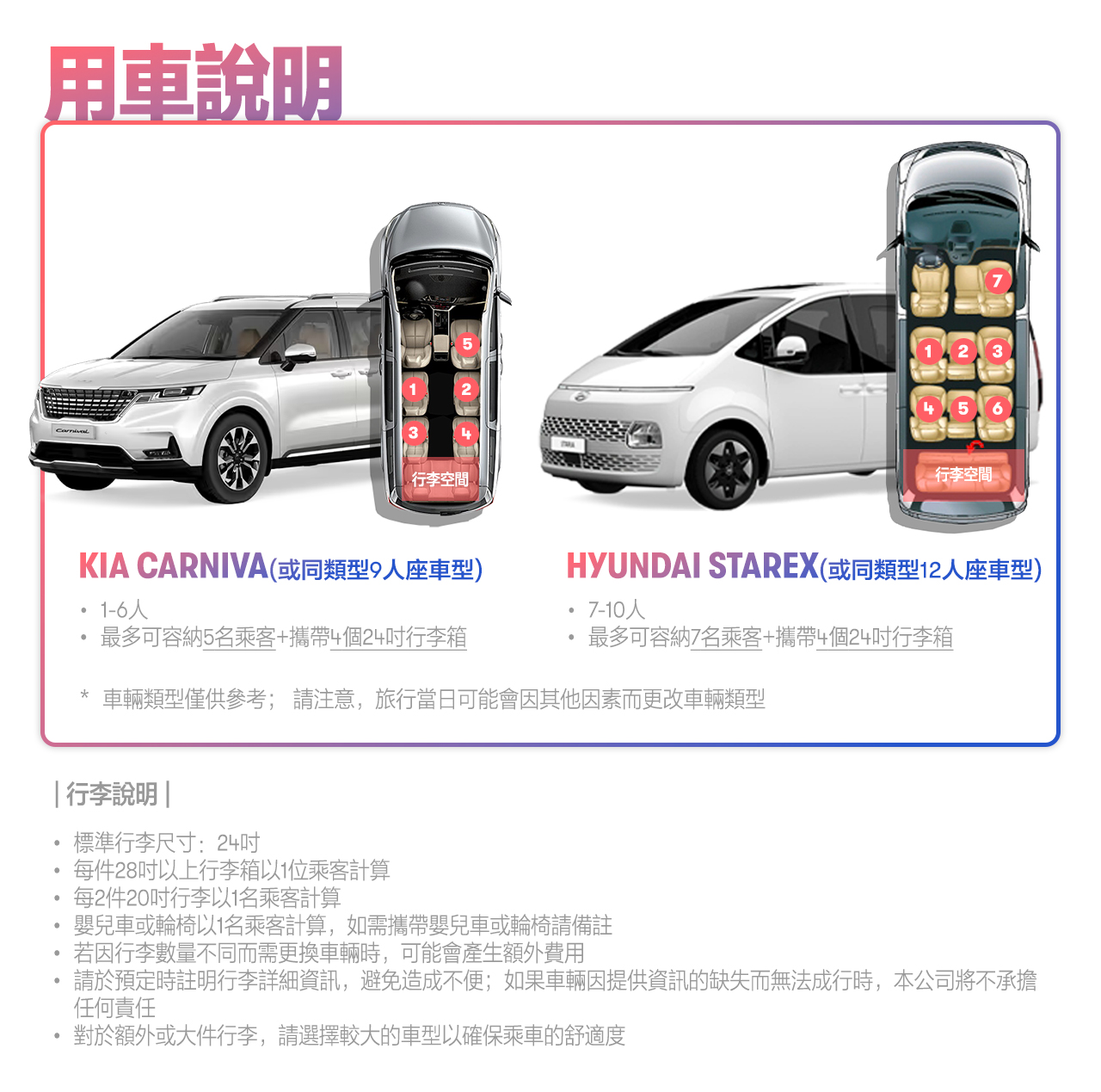 - 若您有額外或大型行李,請選擇較大的車型,以確保旅途舒適