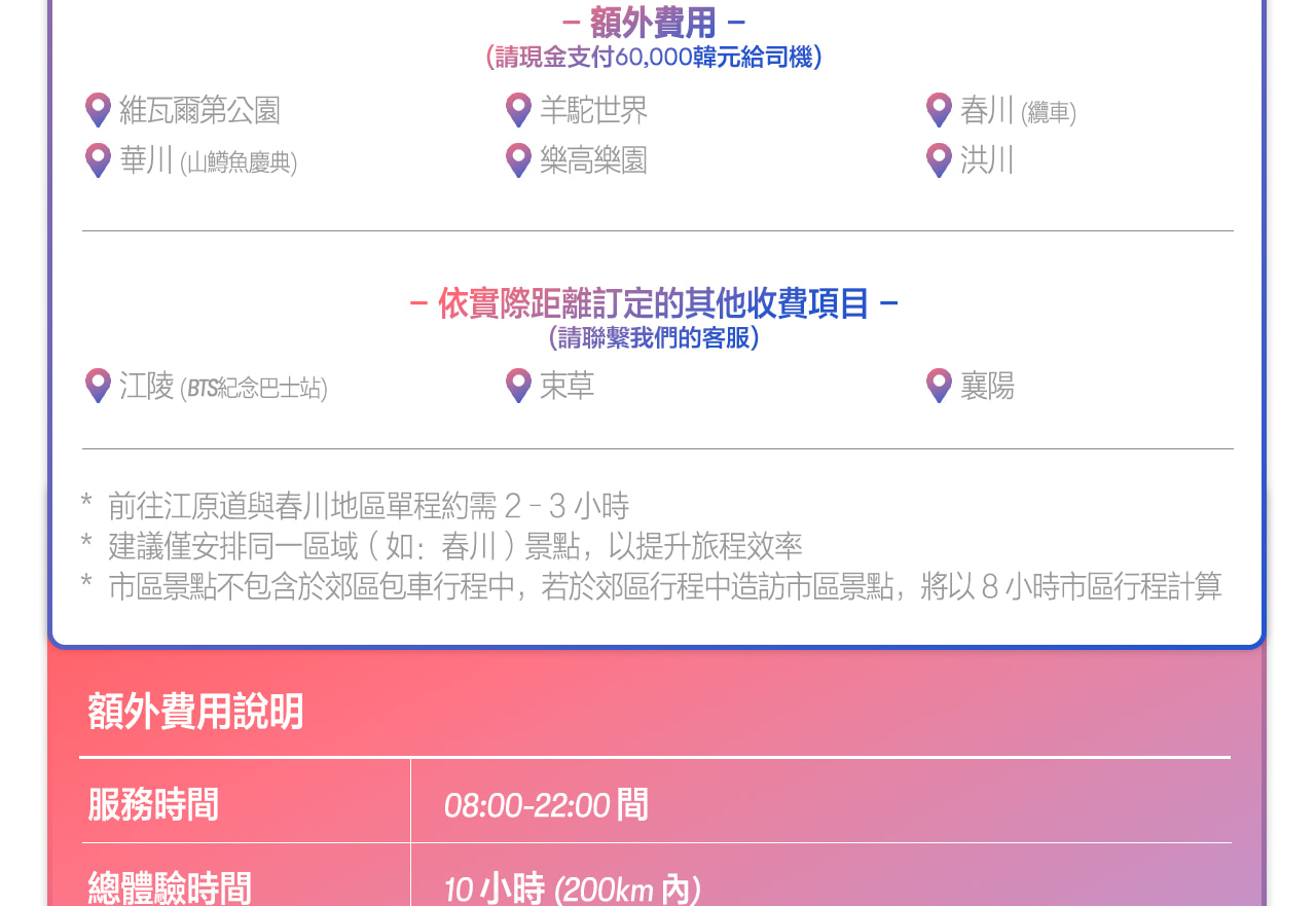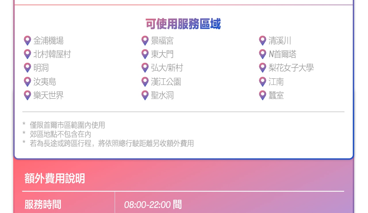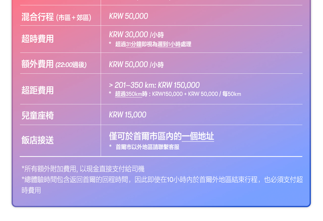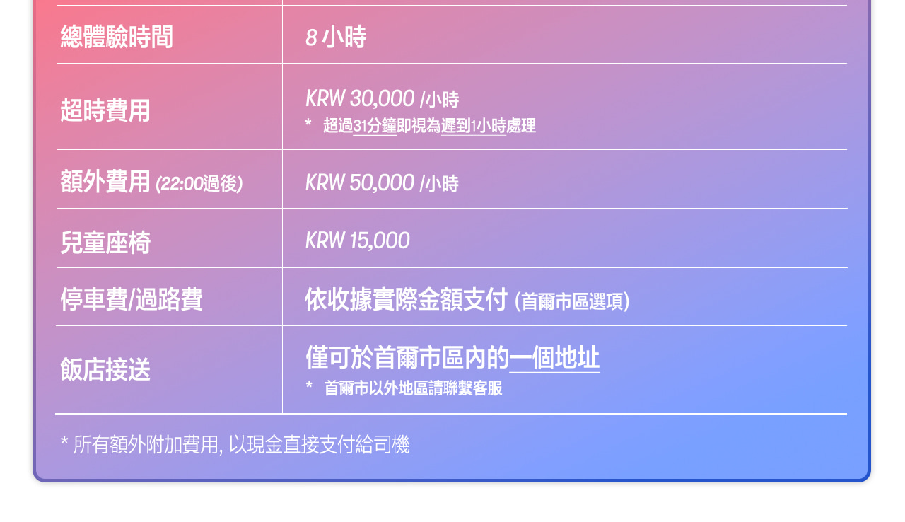 - 於首爾以外地區下車:服務時數包含司機返回首爾的交通時間,若超出服務時數,可能會產生額外加班費用。
