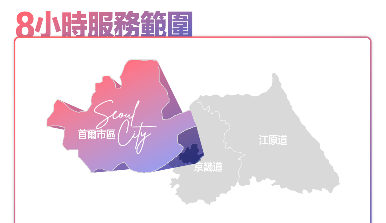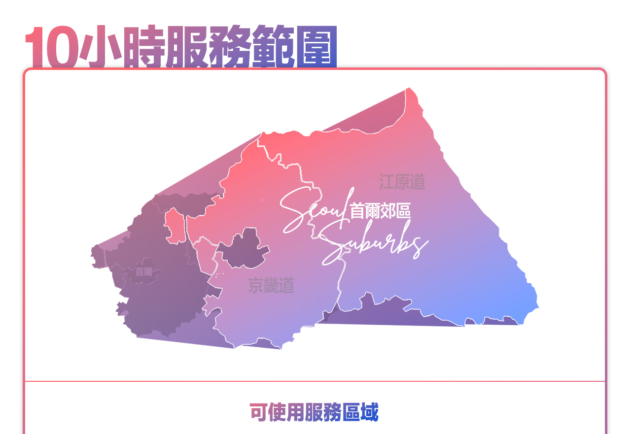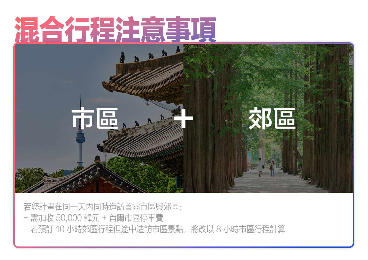 - 於首爾以外地區下車:服務時數包含司機返回首爾的交通時間,若超出服務時數,可能會產生額外加班費用。