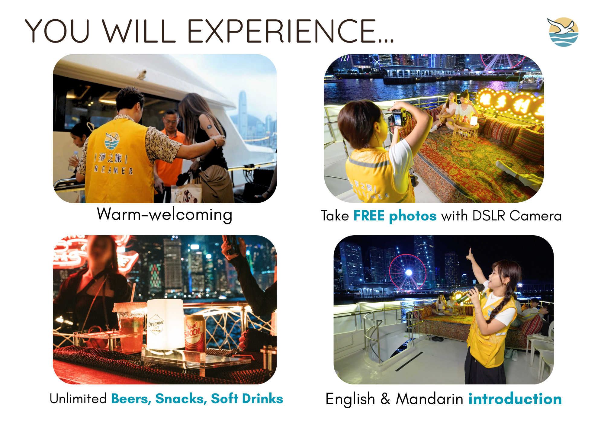 華燈初上,坐在豪華遊艇的頂層,享受360度的全視角景觀,吹著陣陣海風,陶醉於維港兩岸的璀璨燈火之中。飽覽維港夜景之餘,還可坐在舒適的沙發椅上,享用無限提供的的輕食與軟飲,和三五好友一起喝酒暢聊,享受45分鐘的海上巡遊樂趣。每到晚上8點,一場華美盛大的「幻彩詠香江」音樂匯演將為你精彩呈現,維港兩岸約40多幢的摩天大廈將共同參與星光盛宴,維港之景著實令人震撼!搭乘Dreamer夢之旅遊艇,迅速拿起手中的相機,捕捉下這般唯美夢幻的香江之旅。