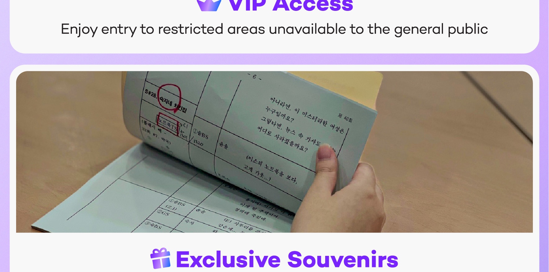 - 獨家紀念品:帶走一份真實的K-Drama劇本(僅限選擇戲劇彩排方案時提供)。