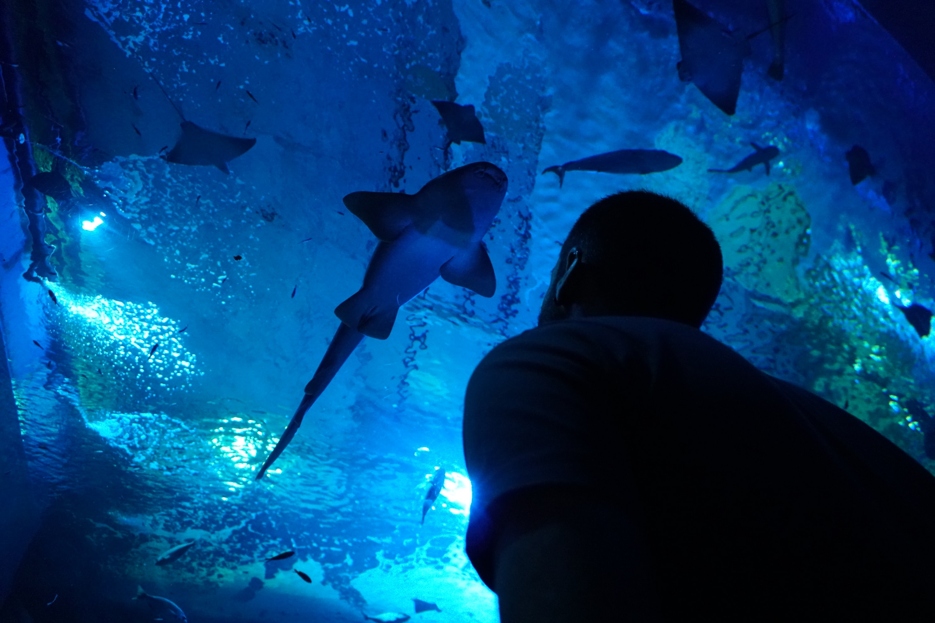 - 親眼目睹令人驚嘆的景象:在一個水箱中,透過可步行的玻璃隧道,觀賞兩條公牛鯊