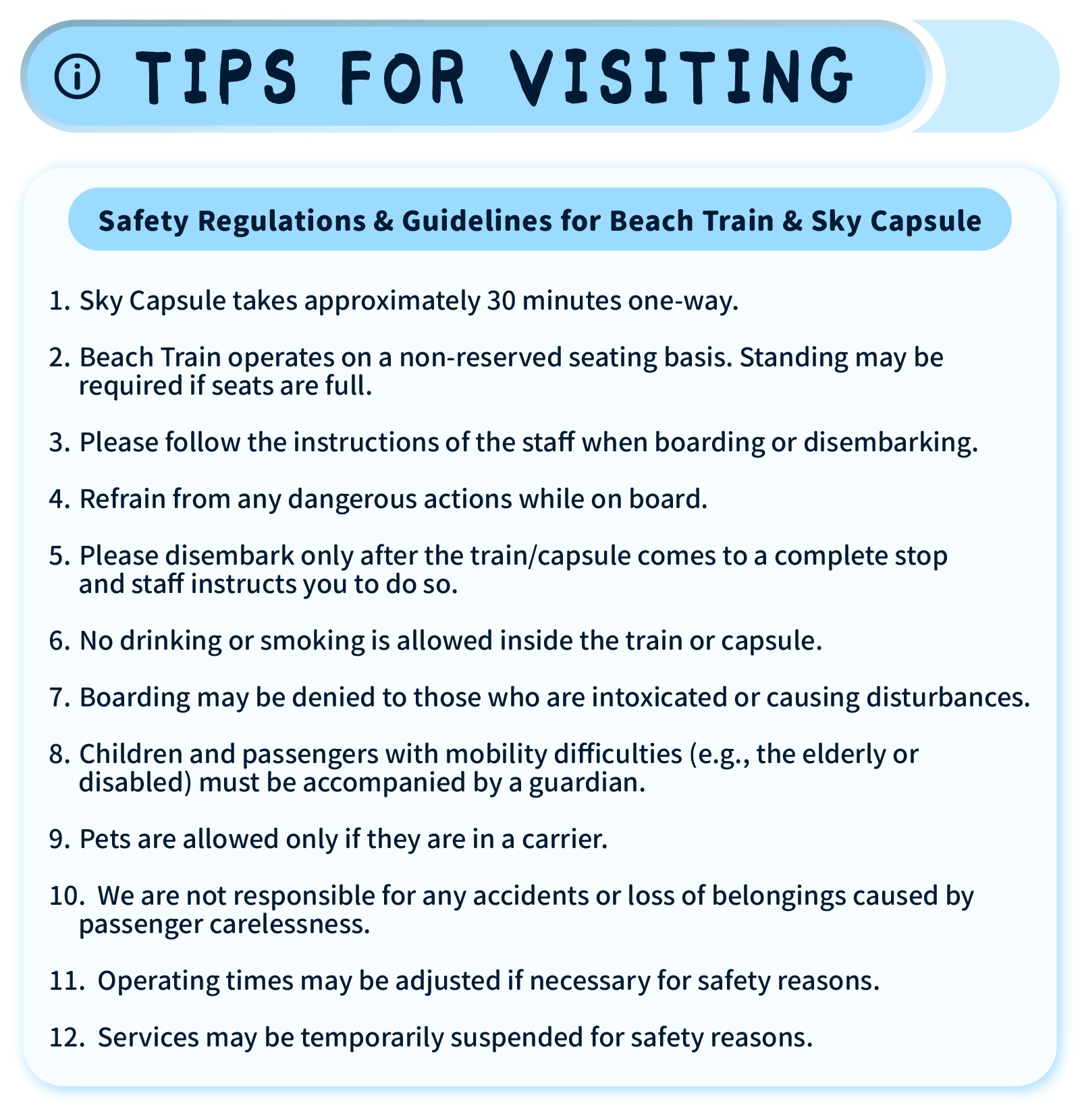 *天空膠囊列車的實際登車時間可能會根據當天情況進行調整。 *天空膠囊列車載客量:每輛天空膠囊列車最多可容納4名乘客,並可能與其他乘客共享。