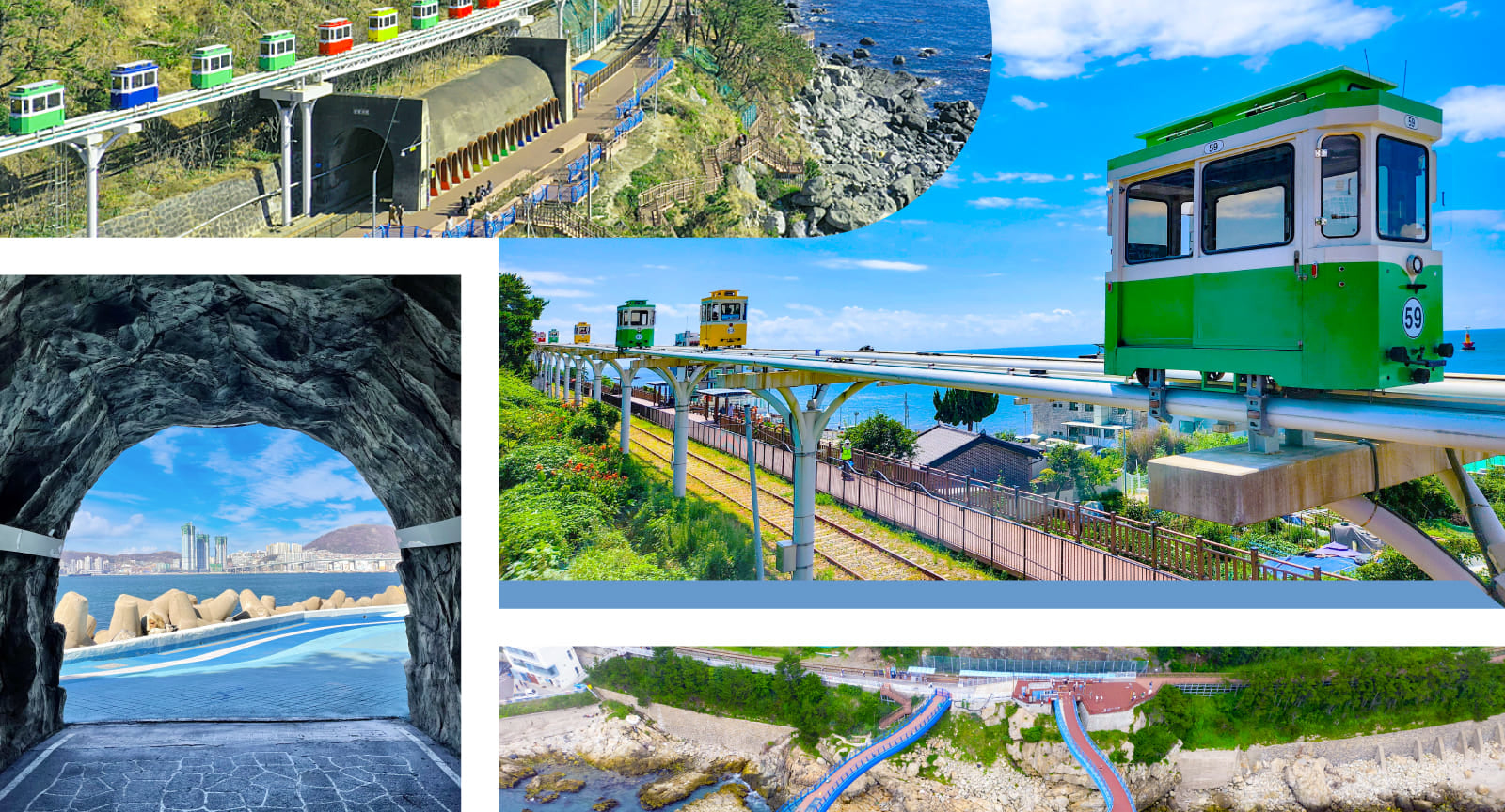 海雲臺海濱列車——提供從海雲臺松亭至Mipo的乘車服務,沿途可欣賞釜山東部海岸的壯麗景色。列車沿著海岸線在地面上行駛,並設有大型車窗。