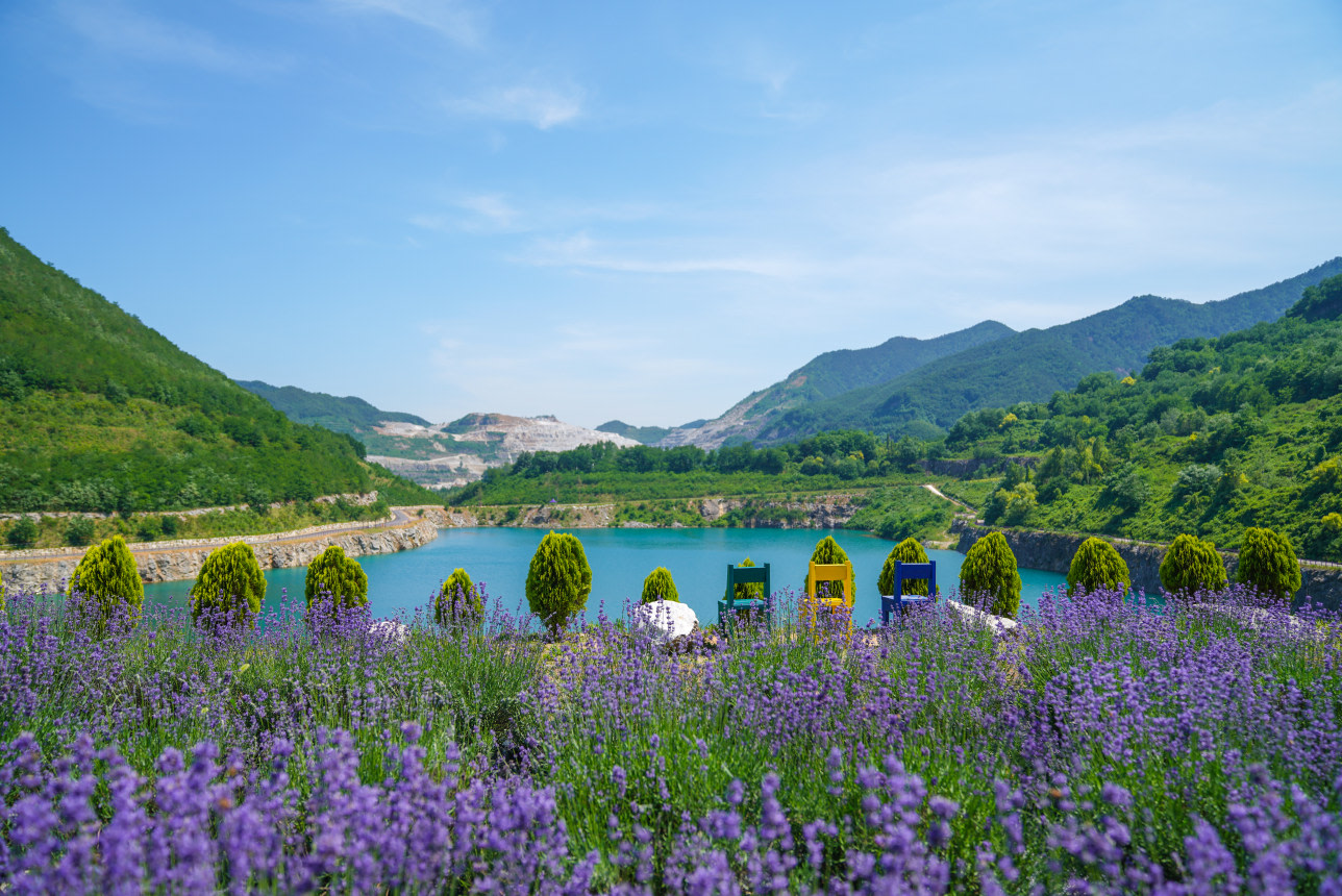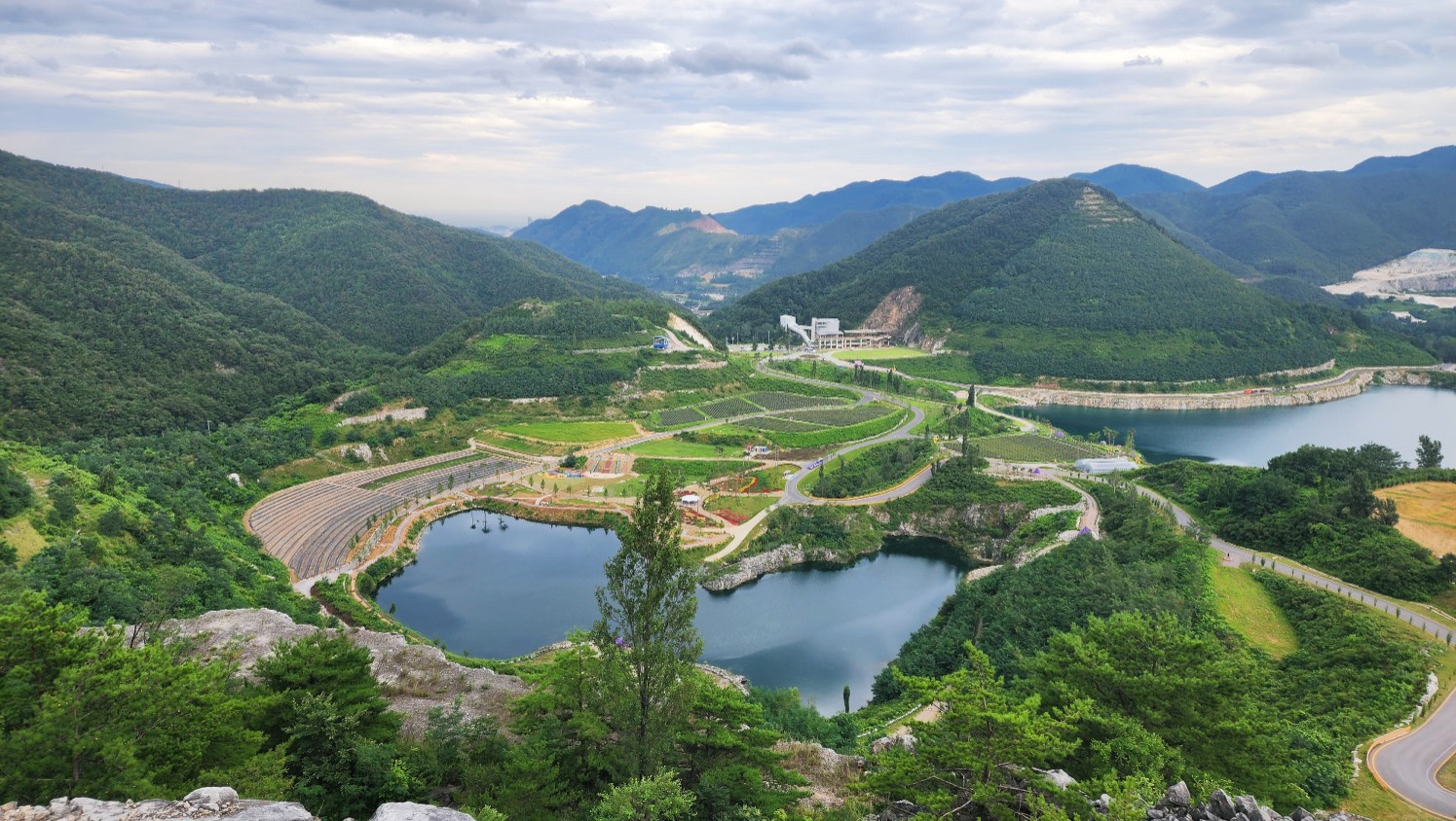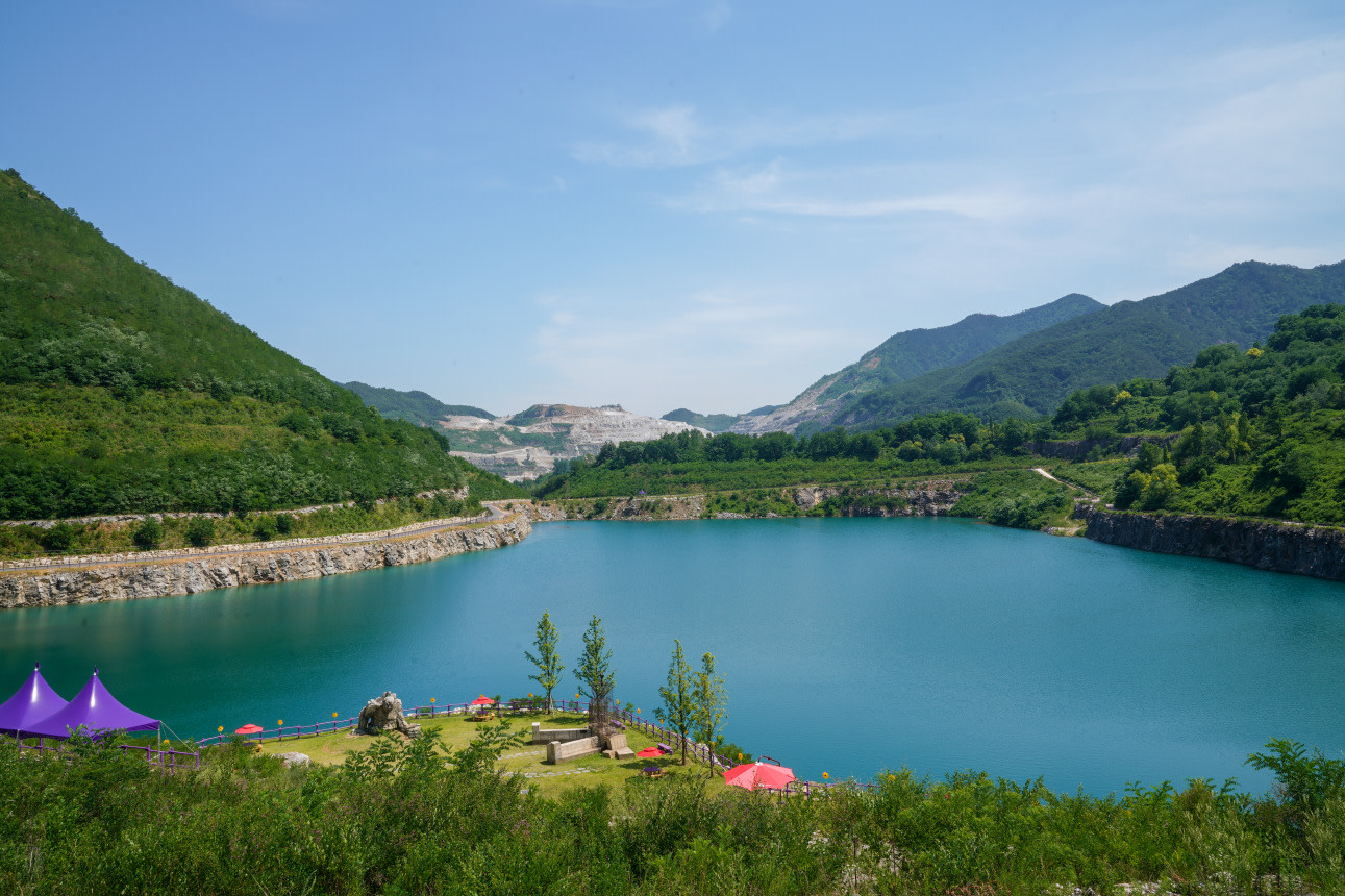 - 當您踏入Muruengbyeol Yucheonji的第一步時,迎接您的是廣闊的自然景觀。鬱鬱蔥蔥的綠色山丘環繞著清澈湛藍的湖泊,背景是高聳入雲的群山。