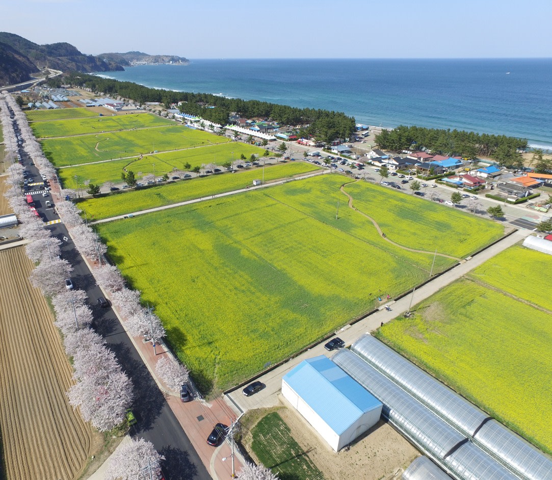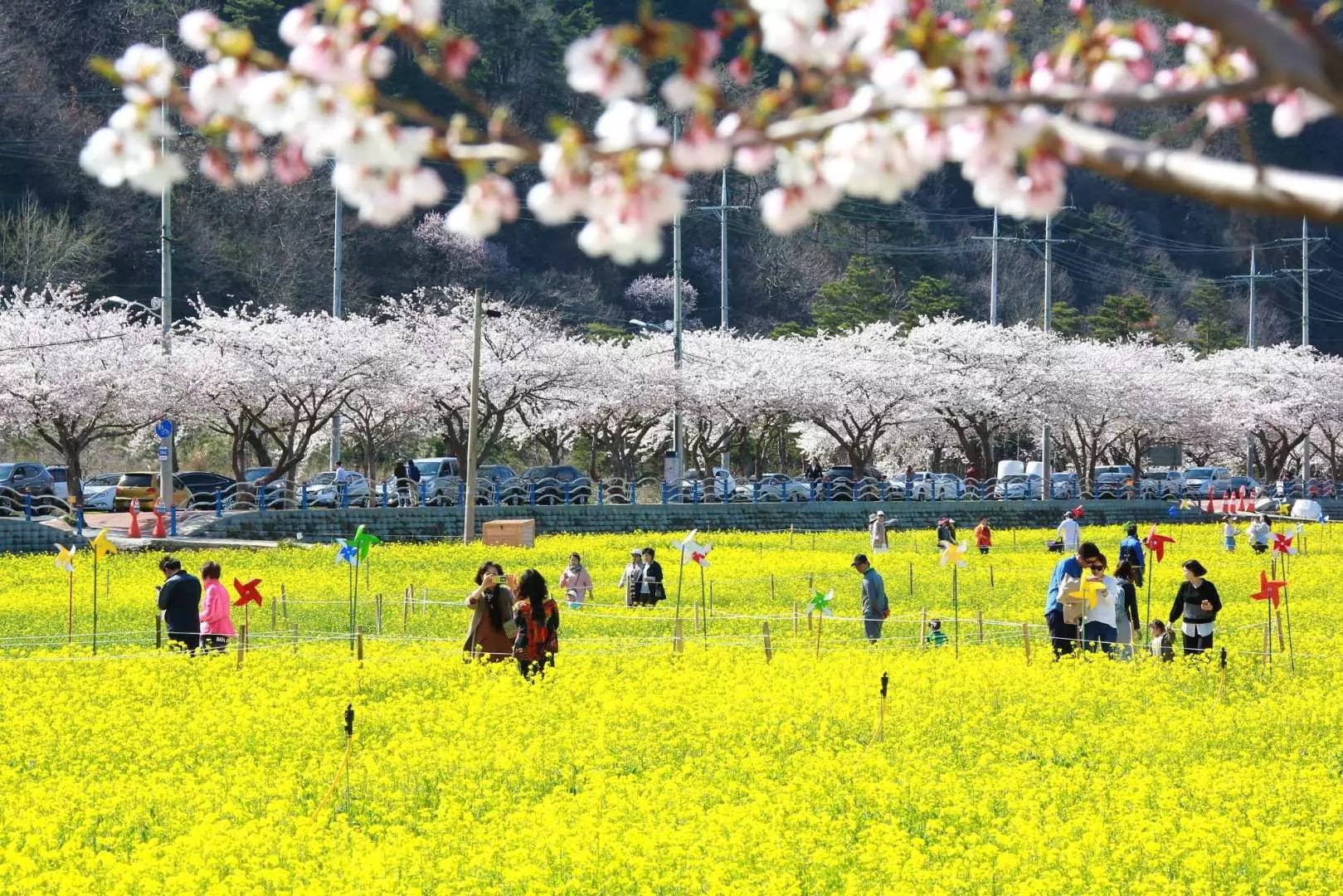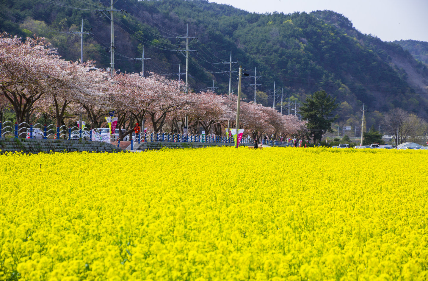 - 4月,三陟市的孟芳海灘上,金燦燦的油菜花和路邊的櫻花樹蔚為壯觀。