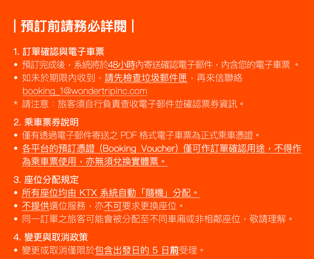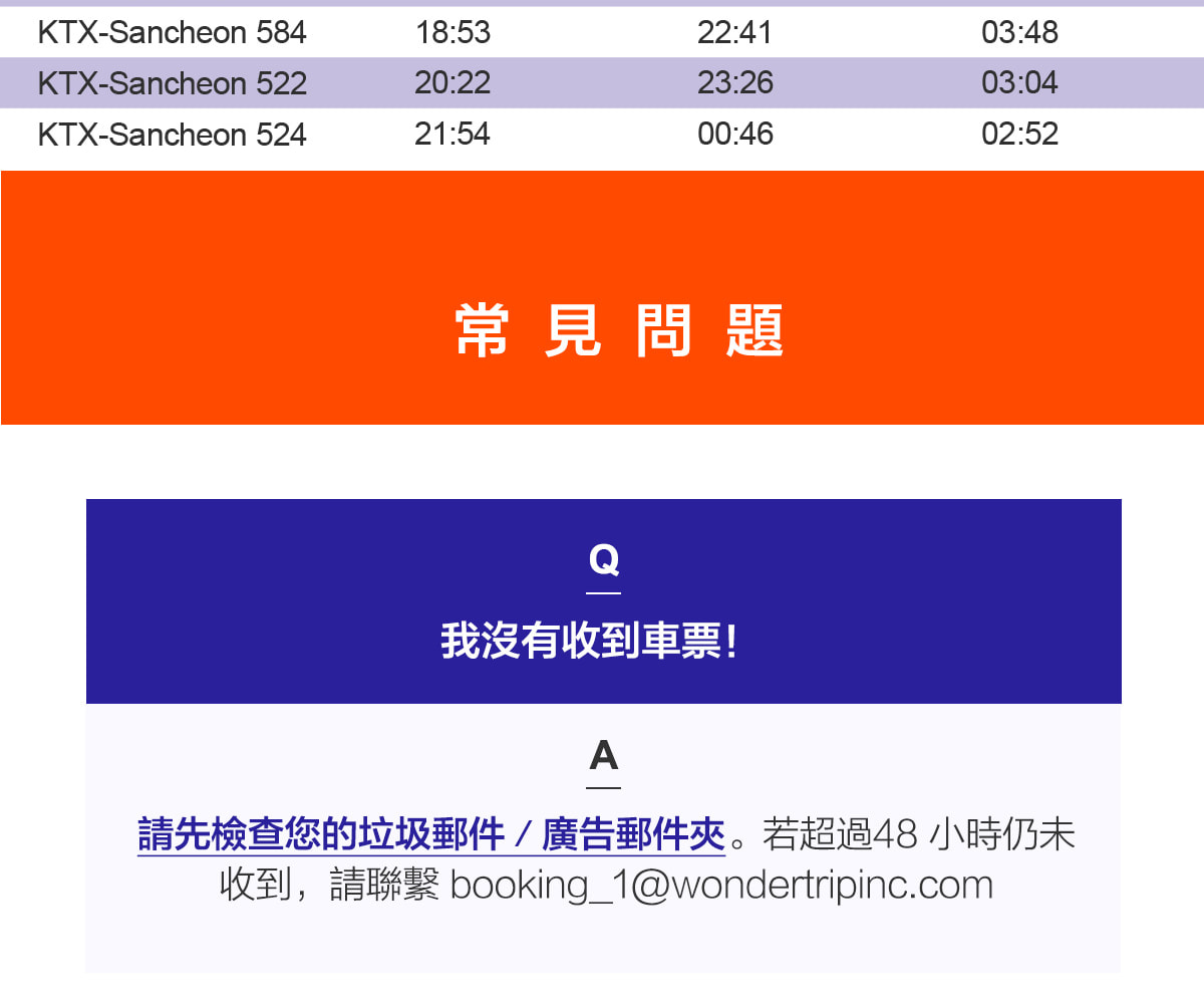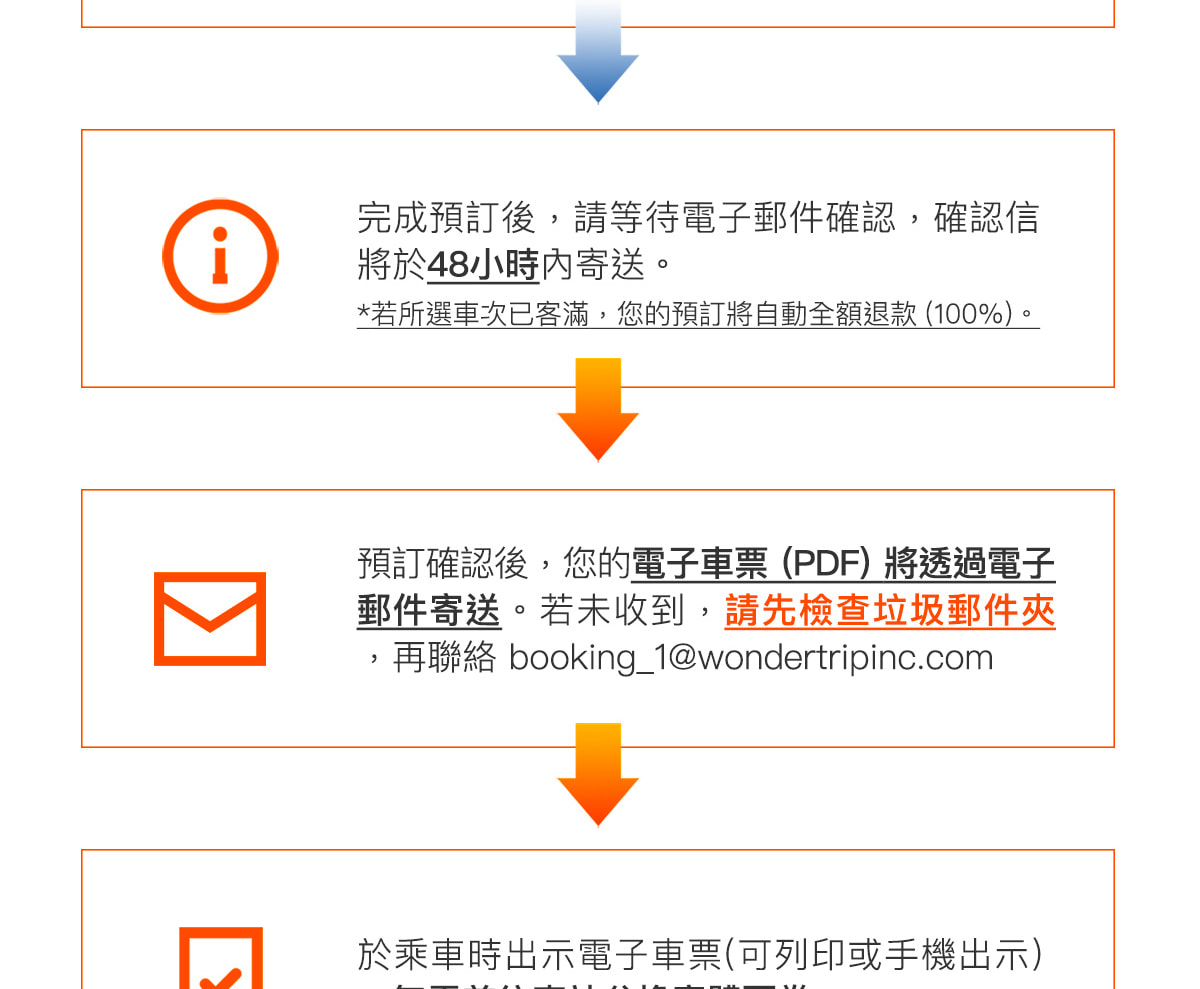- 如果您在48小時後仍未收到電子郵件,請檢查您的垃圾郵件箱或通過booking_1@wondertripinc.com聯繫我們