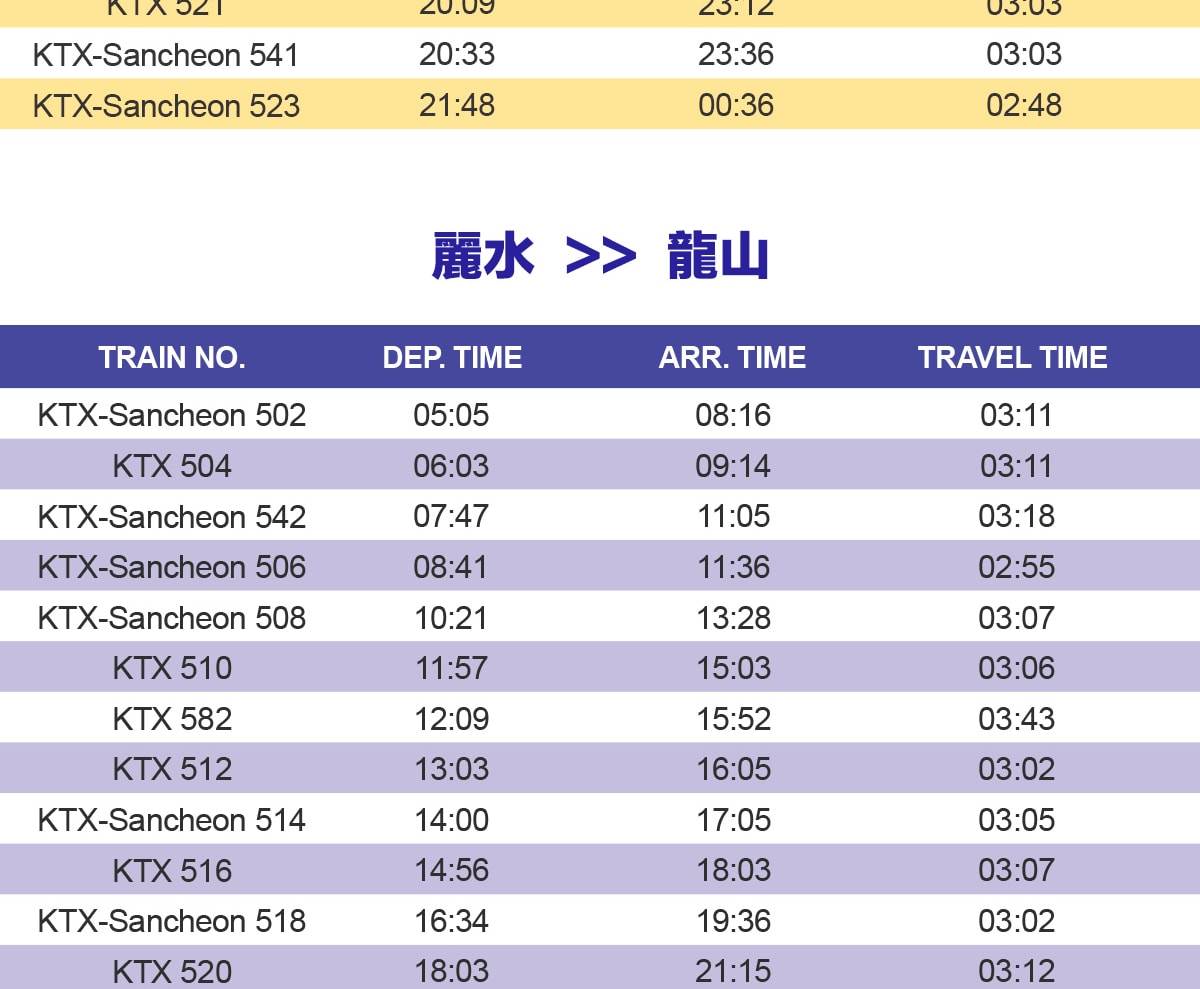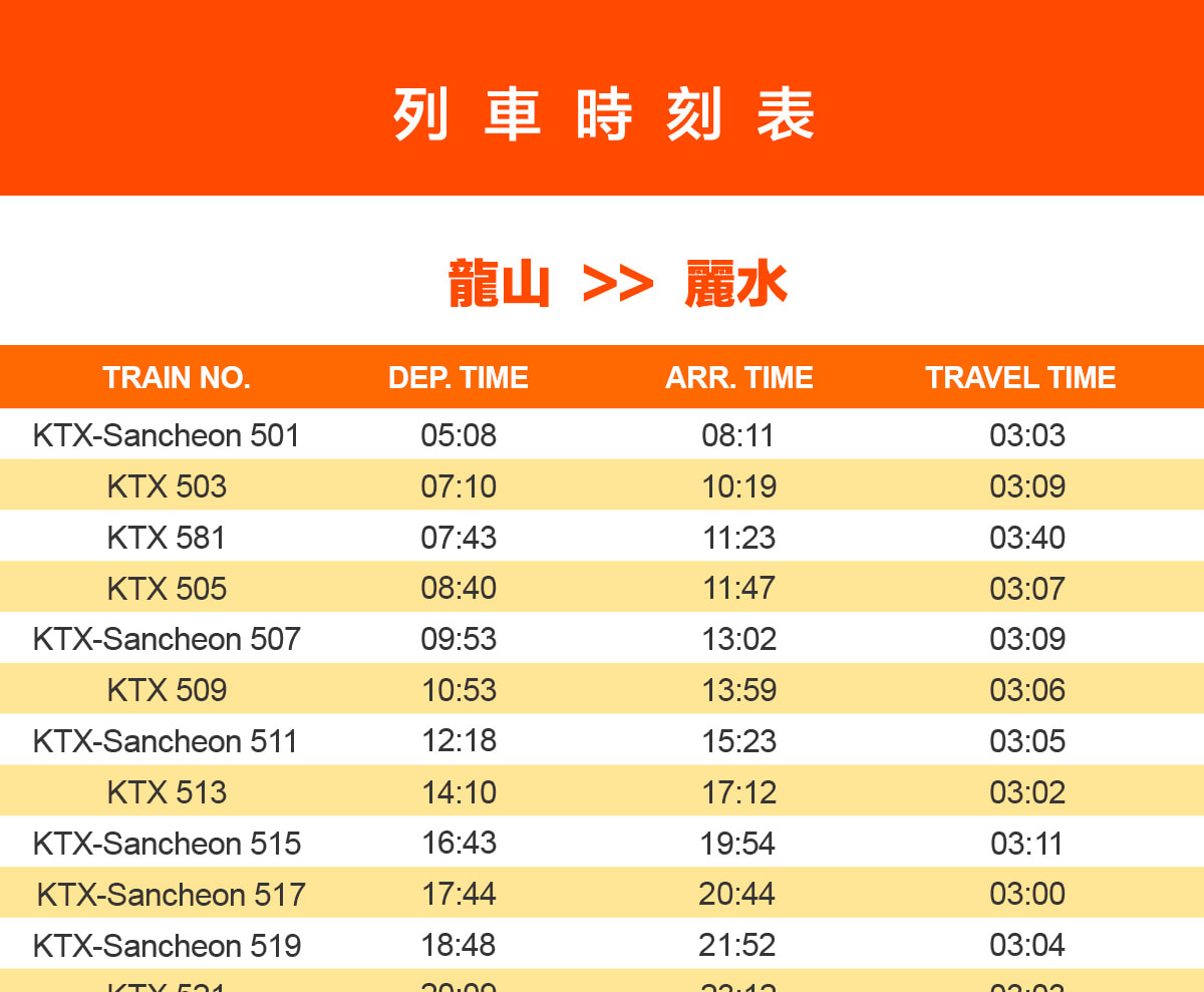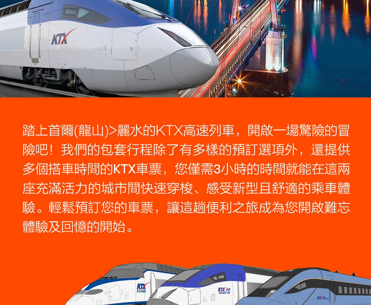 - 輕鬆出行:使用我們便捷的套票,體驗首爾和麗水之間無縫的高速KTX列車之旅