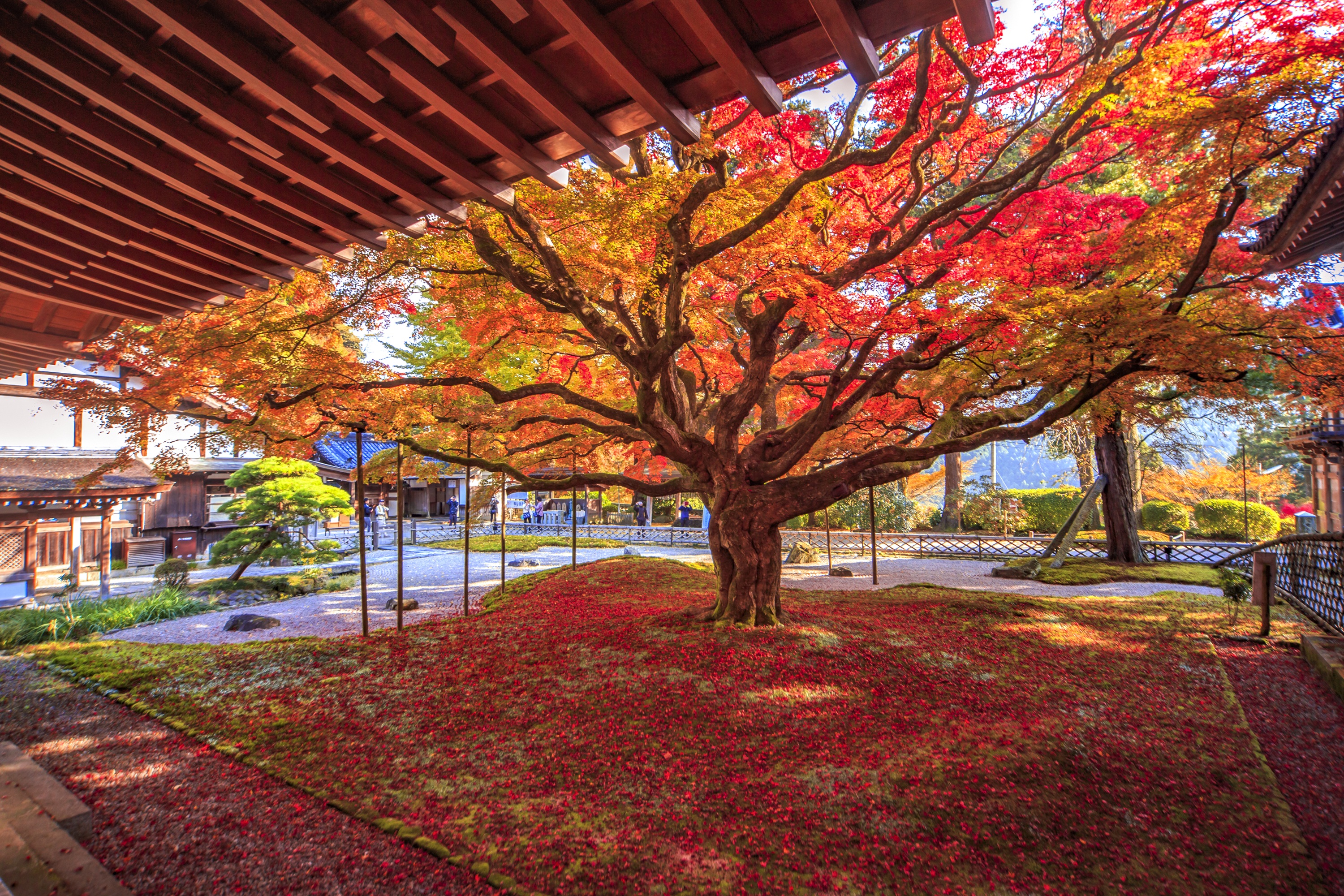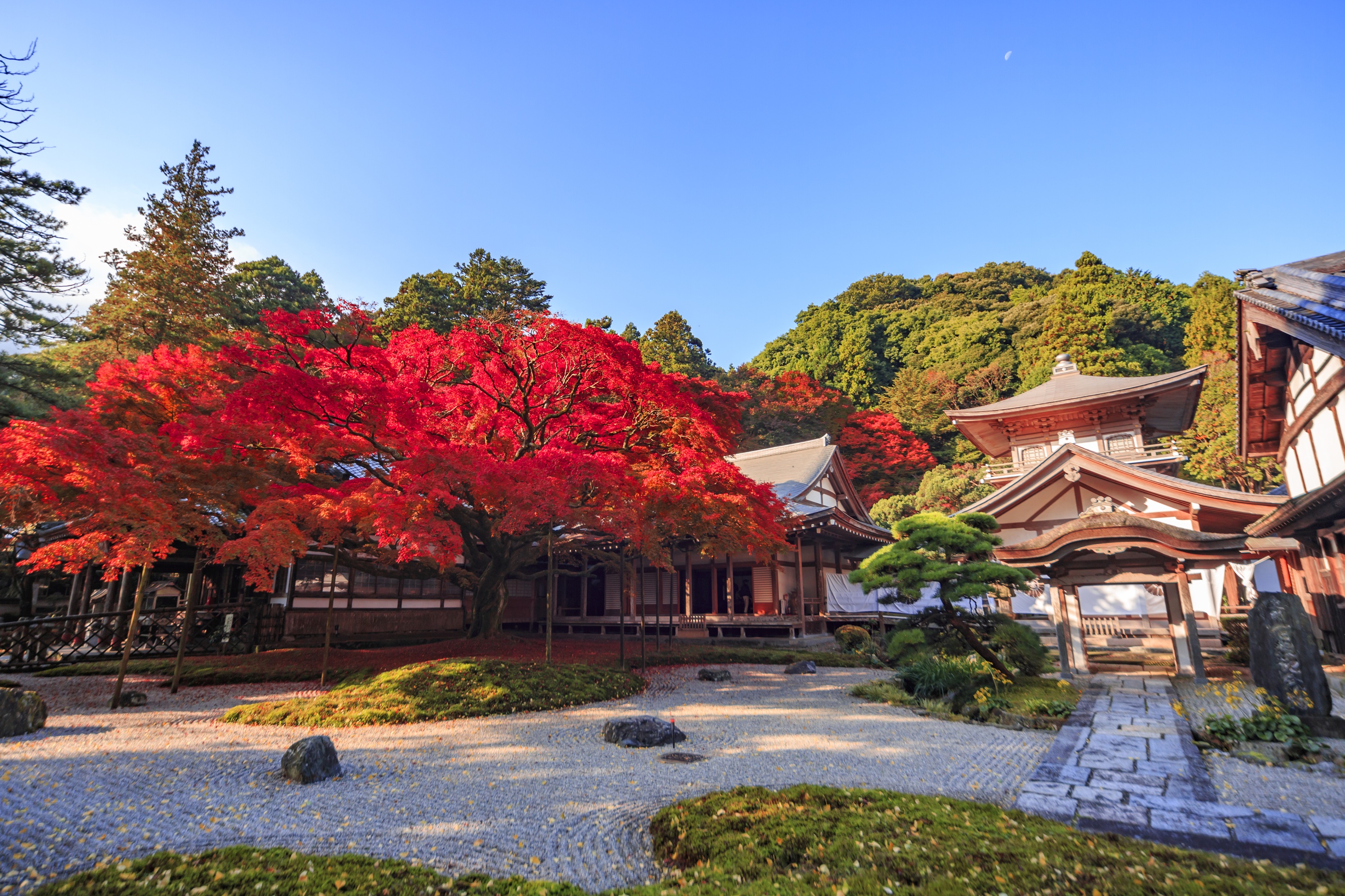 秋季時,千如寺境內數百棵楓樹同時染紅,漫山遍野一片火紅景象壯麗動人。寺院莊嚴古樸的建築與滿園紅葉交相輝映,營造出如畫般的夢幻景致。