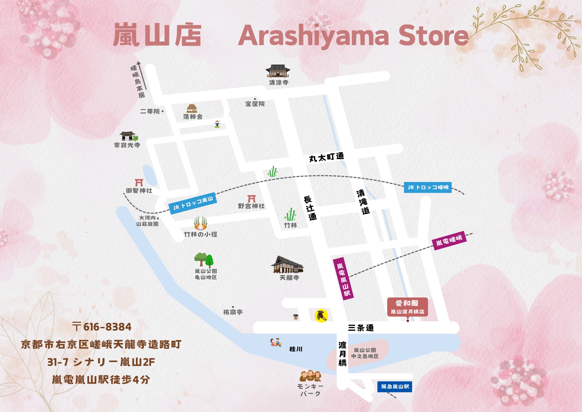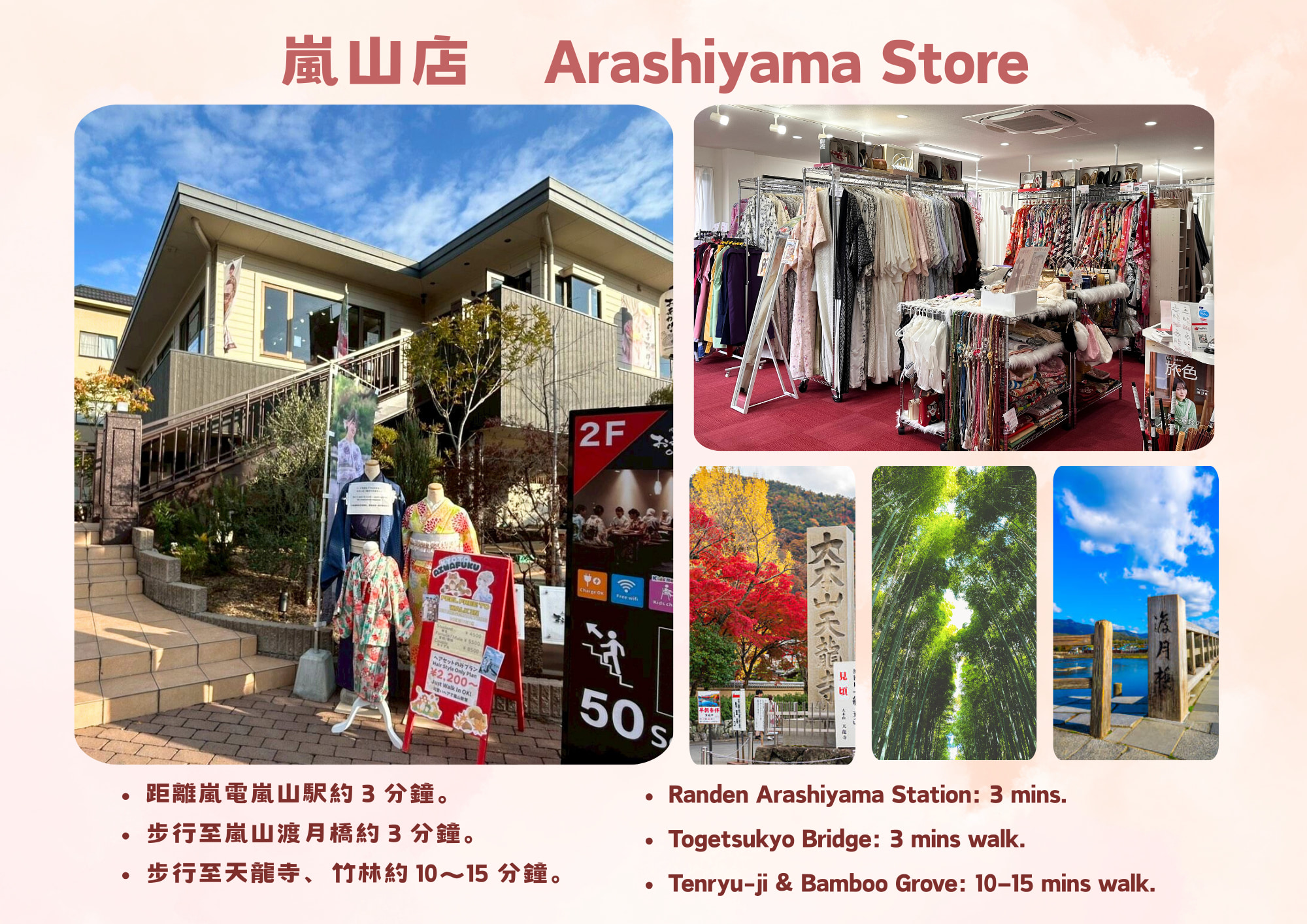 距離渡月橋和竹林小徑步行即可抵達。換上和服後,可以直接前往嵐山具代表性的觀光景點。在四季變幻的美景中享受拍照的樂趣,觀光結束後只需回到店裡換下和服即可。這是能同時享受嵐山散步與和服體驗的理想地點。