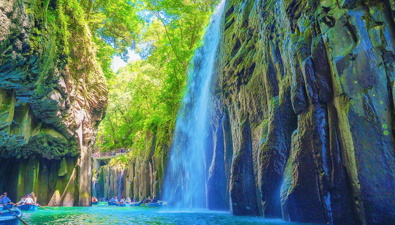 由遠古火山噴發形成的峽谷,被譽為“日本最美峽谷”。您將沿著步道下行,欣賞鬼八力石、真名井瀑布、三座橋樑與壯麗的“仙人之屏風巖”。