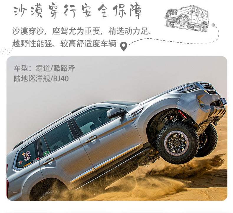 - 專職司機:當地活地圖,帶您開啟野奢度假之旅,銀川 24 小時接送站服務,隨走隨停不等待。五湖穿越段安排豐田系列越野車,配備專業駕駛員,堪稱沙漠裡的活地圖。