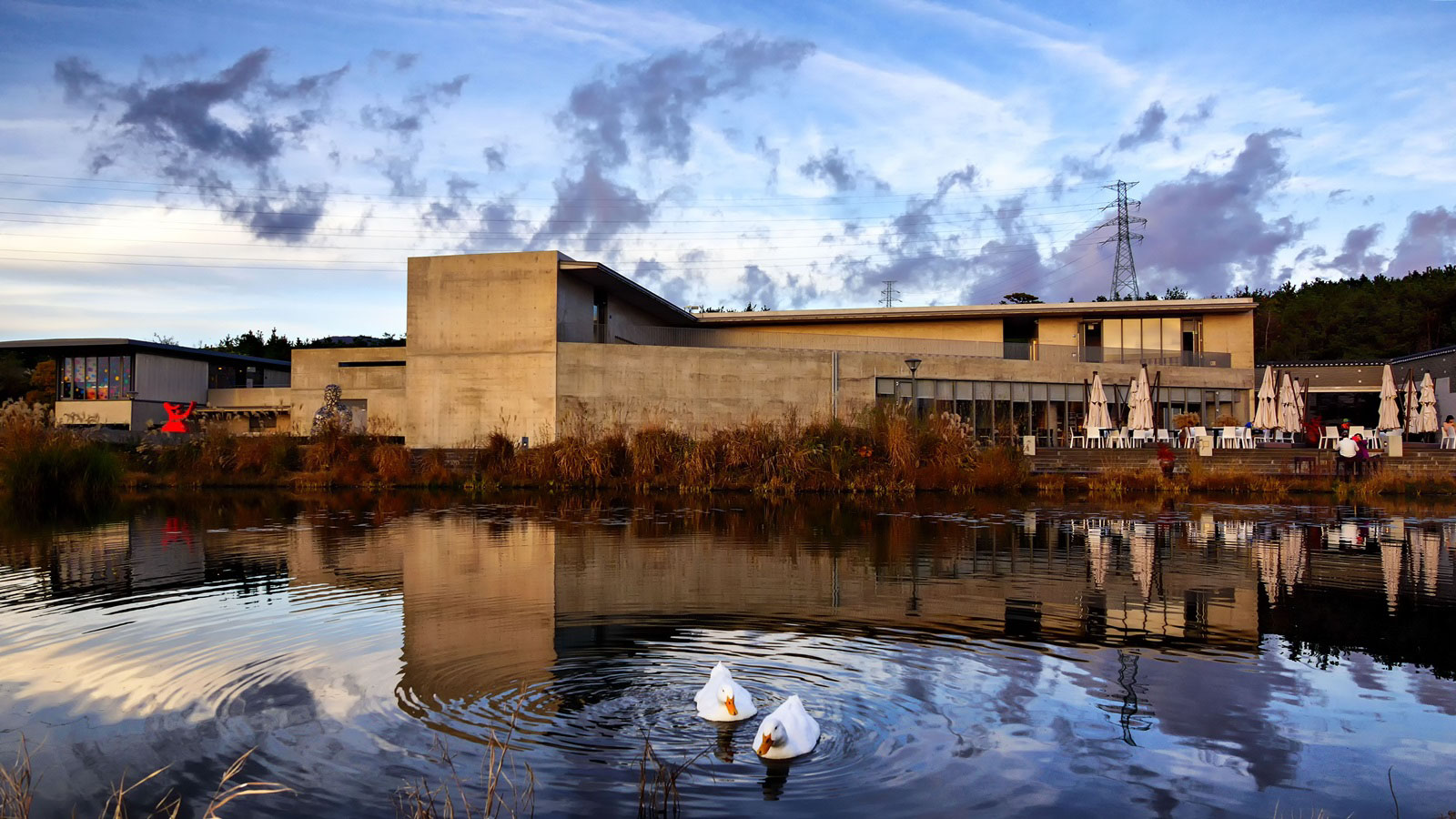 - 建築元素融合了光和水,與讓人聯想到大理石的裸露混凝土結構自然融合。