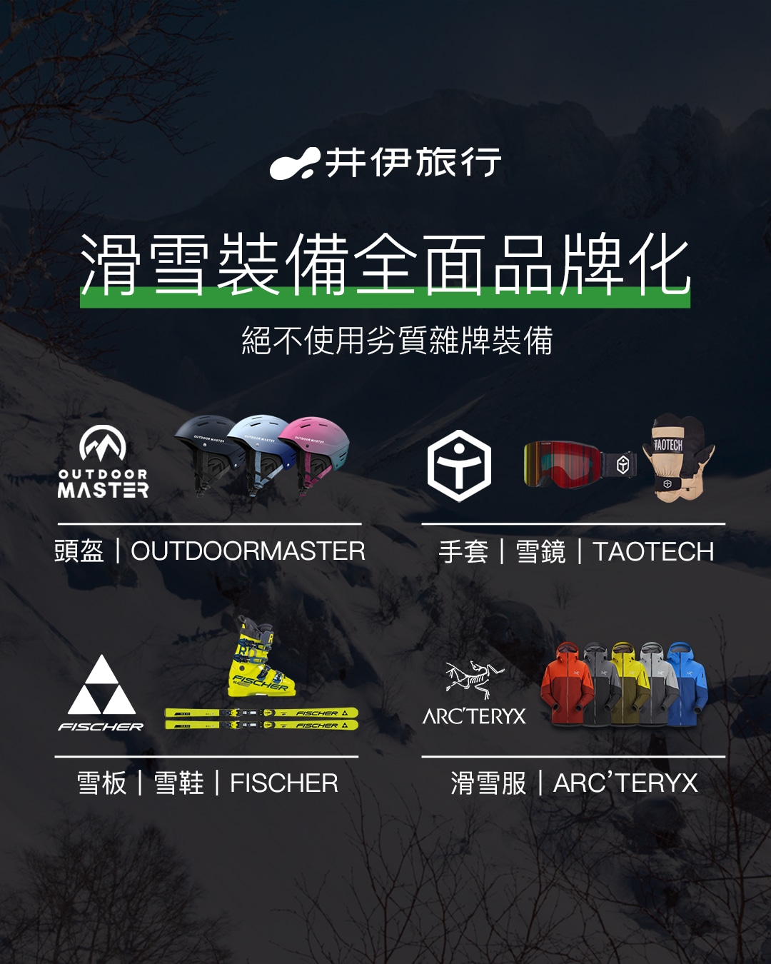 全員持有加拿大 CASI/CSIA 認證,中英雙語無縫教學,全球旅客零障礙體驗。 - 裝備全面品牌化:衣 Arc’teryx|盔 OutdoorMaster|板鞋 Fischer|鏡手套 Taotech