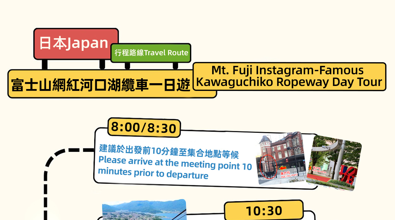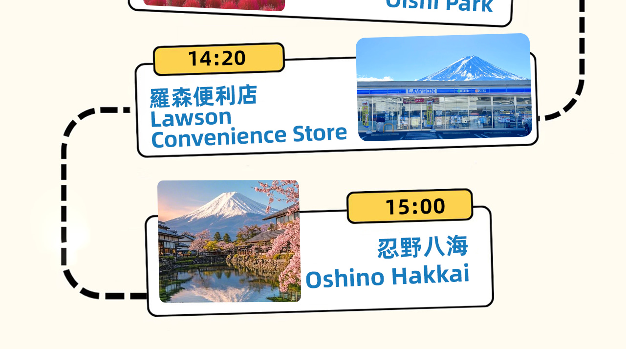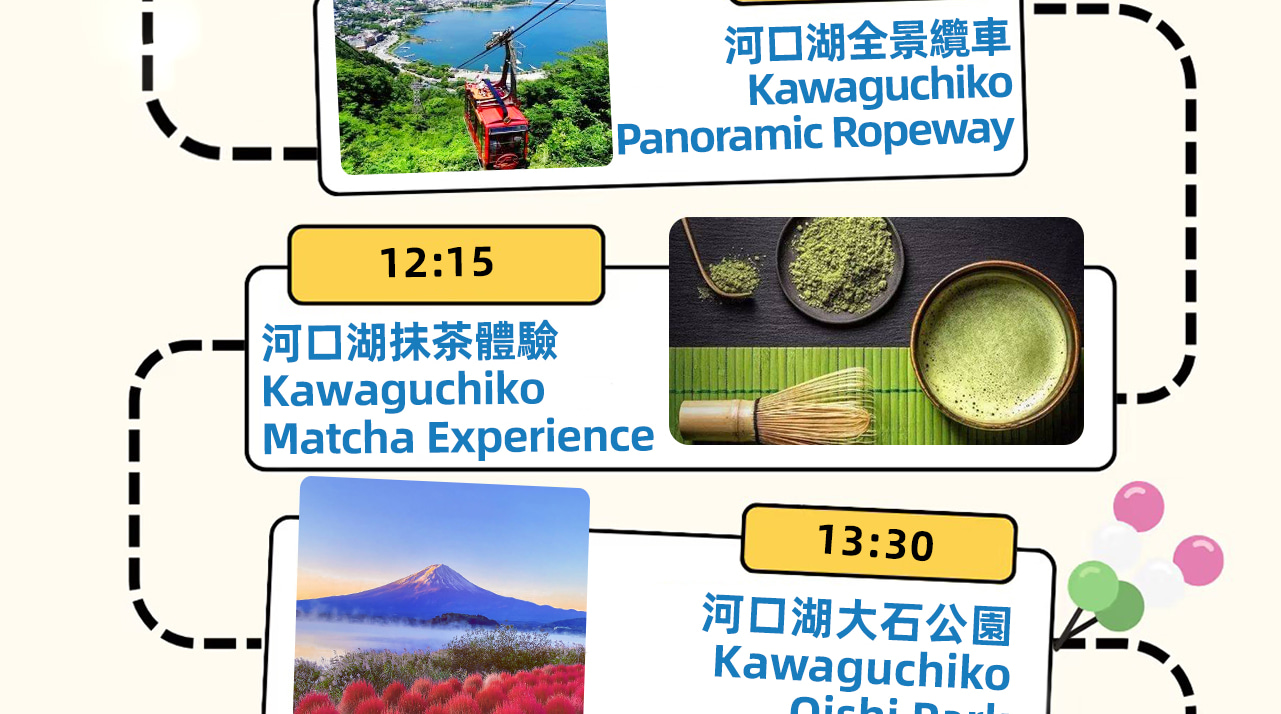 - 🌸今天我們一共將去5個景點/體驗活動,從-河口湖網紅全景Kachikachi山纜車---河口湖抹茶體驗---河口湖大石公園---羅森便利店---忍野八海,充實的行程,從現在開始🌸