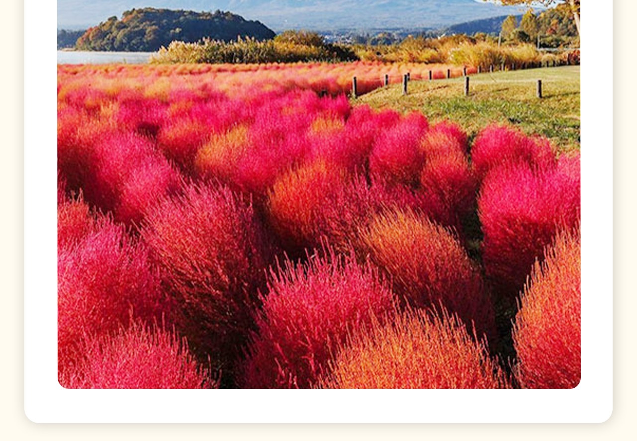 - 第三站:河口湖大石公園,每到夏天,河口湖畔大石公園內的薰衣草盛放,猶如給公園披上了一層紫色的絨毯,與富士山之景遙相輝映,美不勝收。到了秋天,園內的掃帚草(地膚)會變為赤紅色,毛茸茸的特別可愛。這裡還是河口湖香草節的會場。(薰衣草6-7月,海棠花、大波斯菊7-9月,10月有地膚)。