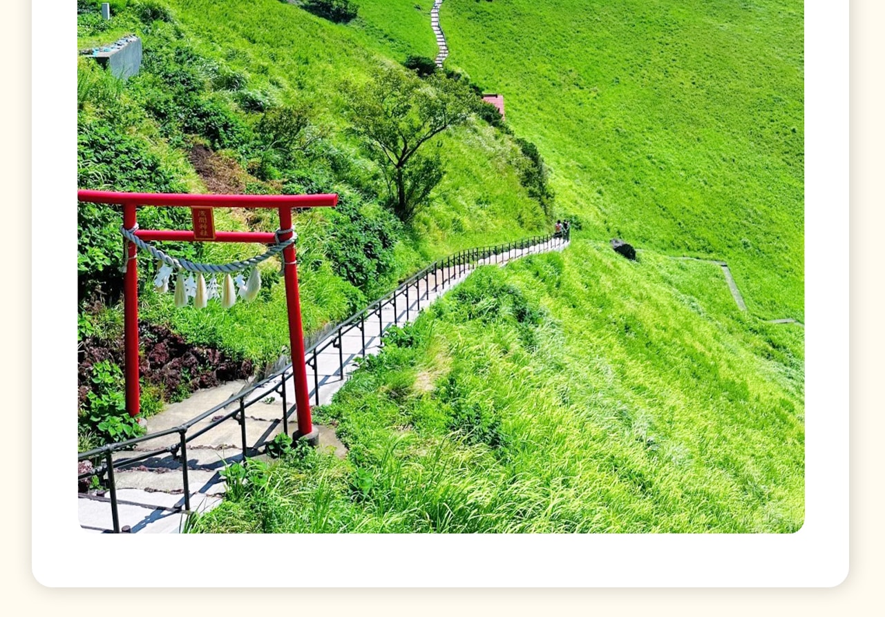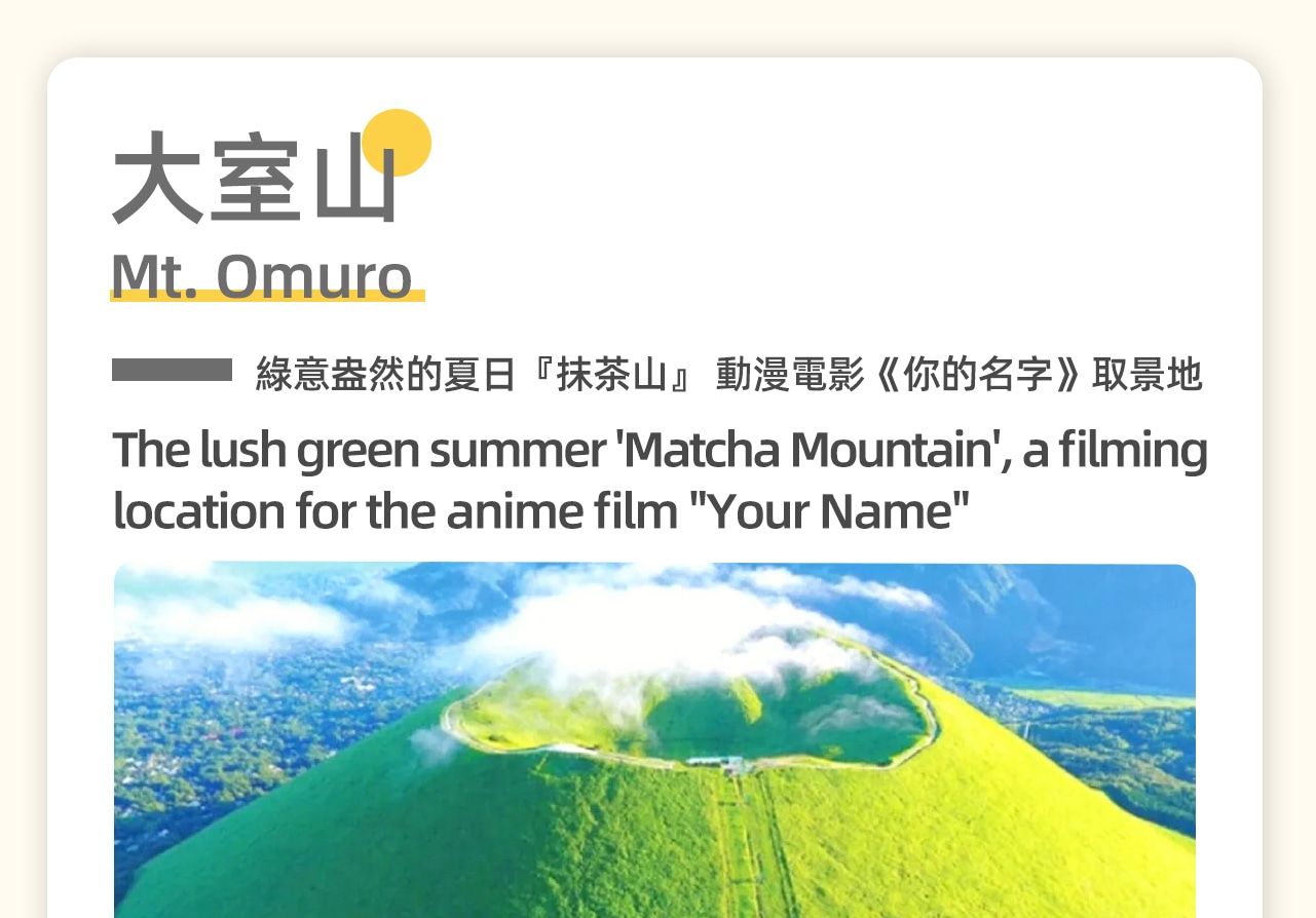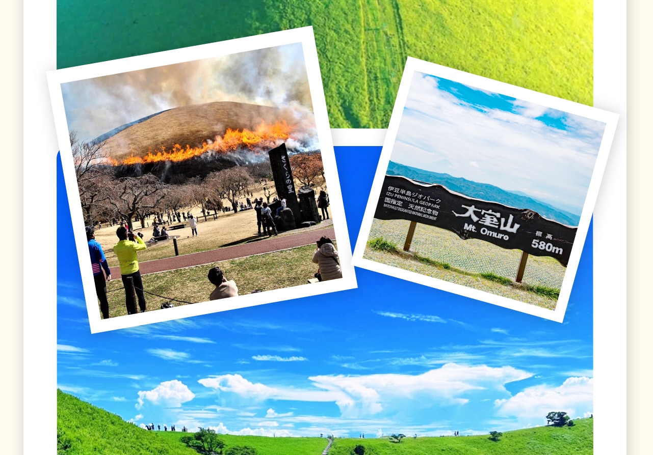 大室山是伊豆高原的代表景點,形似抹茶蛋糕。夏季綠意盎然,從山頂可以看到富士山和相模灣的美景。