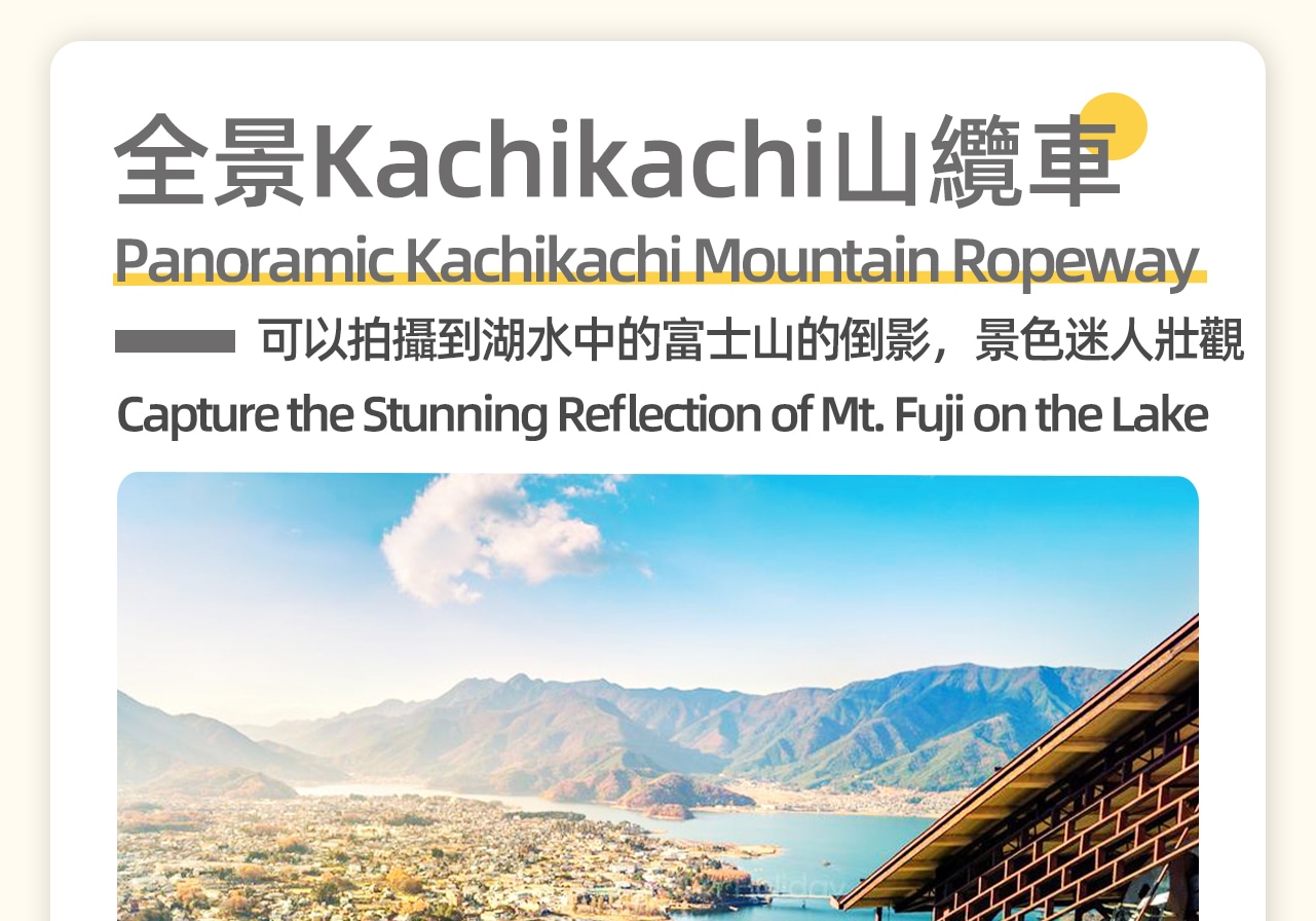 乘坐Kachikachi山纜車,可在1075米的展望臺上欣賞富士山和河口湖全景。晴天時還能看到南阿爾卑斯山。
