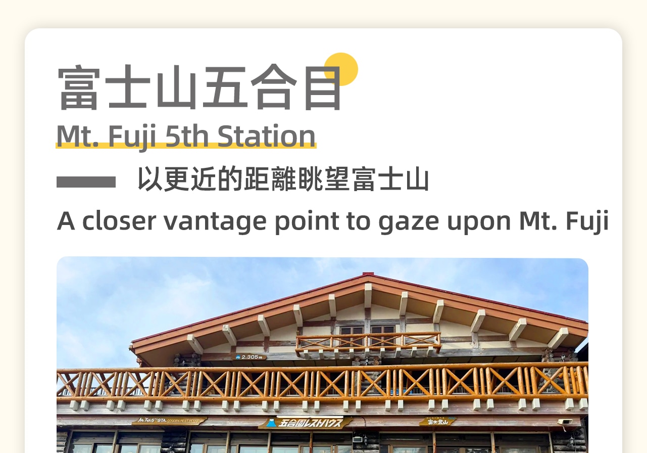 富士山五合目位於富士山的半山腰,海拔2305米。這裡是觀賞富士山的最佳位置,晴天時可俯瞰河口湖和周圍景色,雲霧時則可觀賞夢幻雲海。