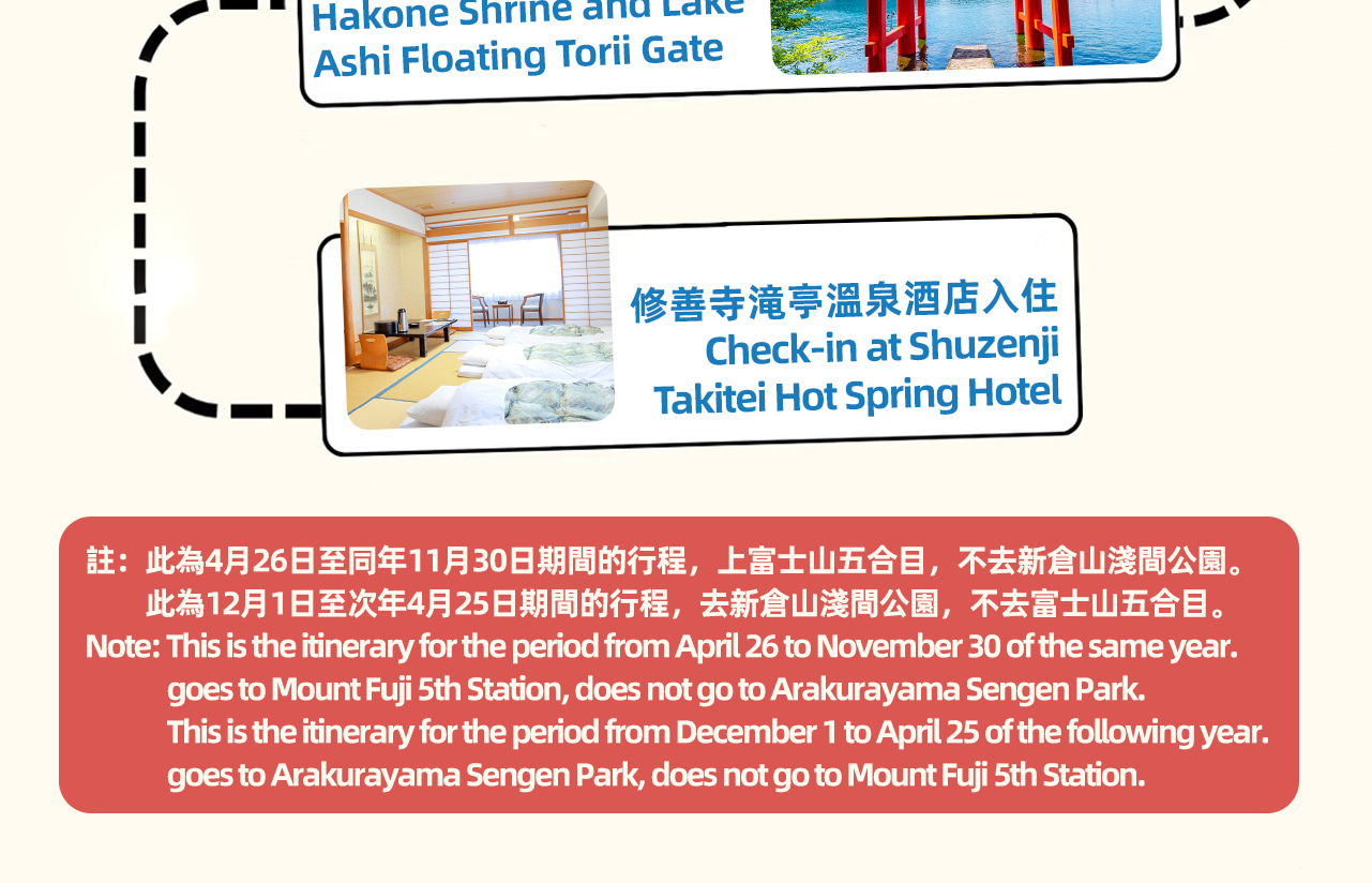 - 若未在該時間(出行前一天20:00-21:00)後收到行前通知信,請顧客直接聯繫易遊網客服人員或旅行社(81-0558-72-0800 )。