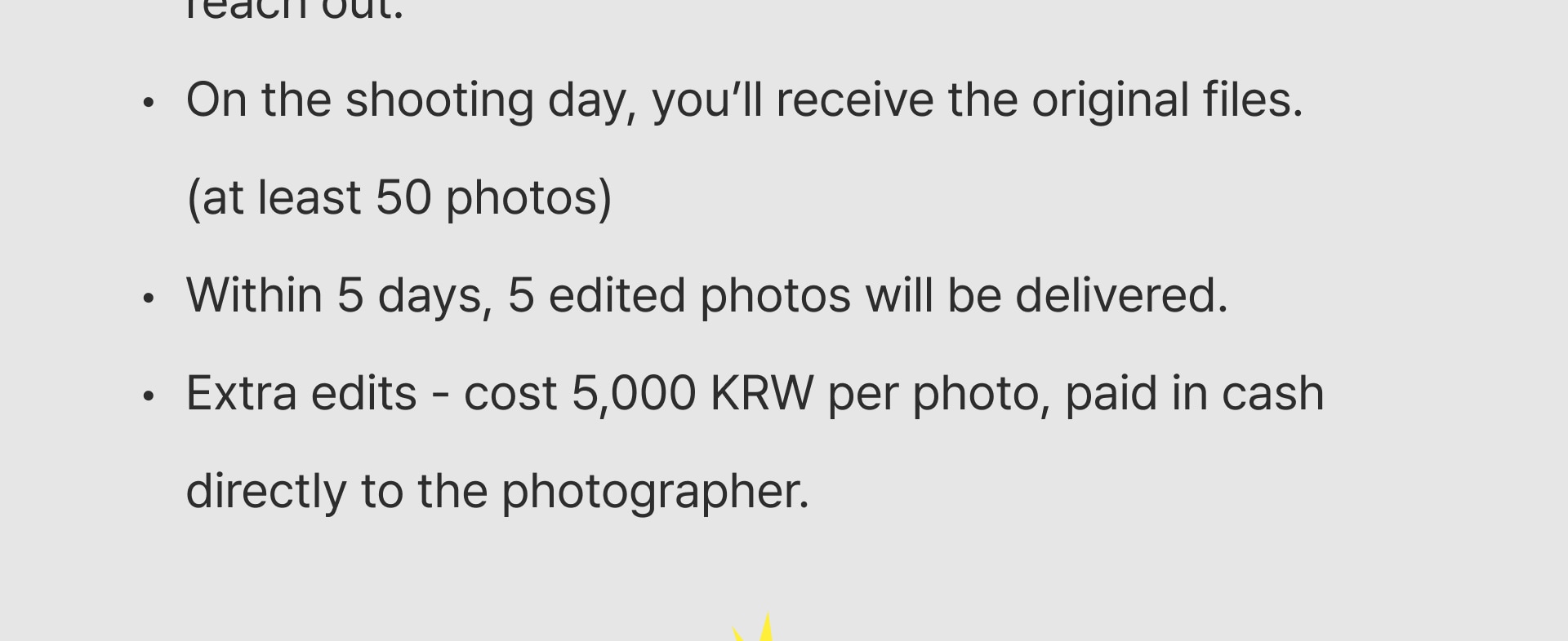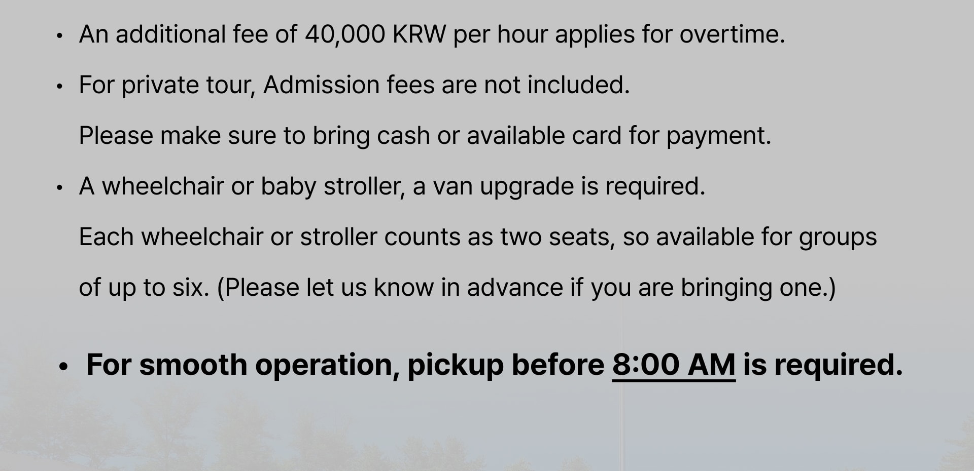 - 私人包車行程總時長為 10 小時,不論行程內容。若總時長(從接載到送返)超過 10 小時,將加收每小時 40,000 韓元的費用。