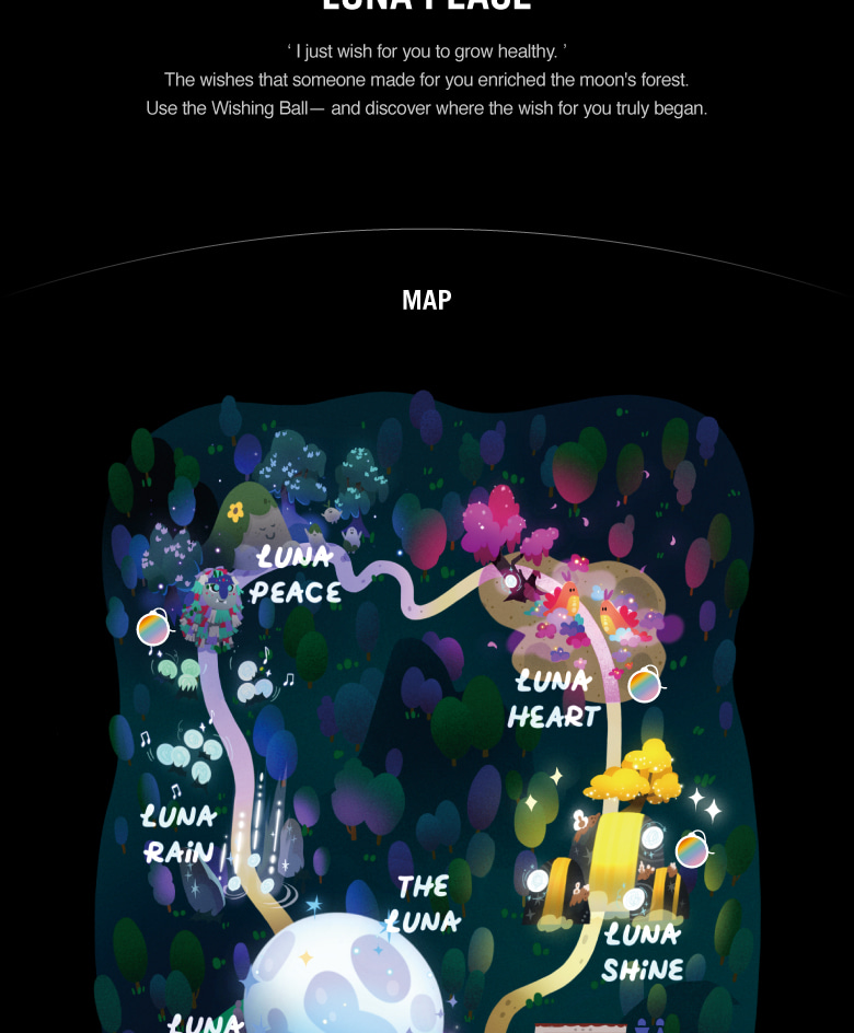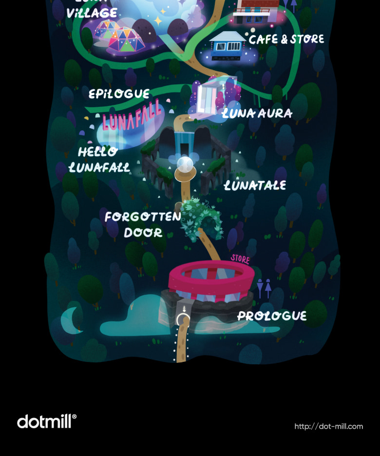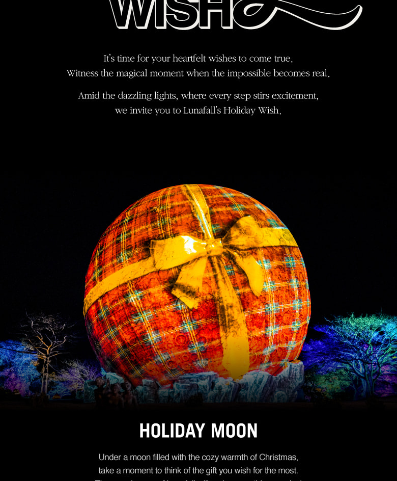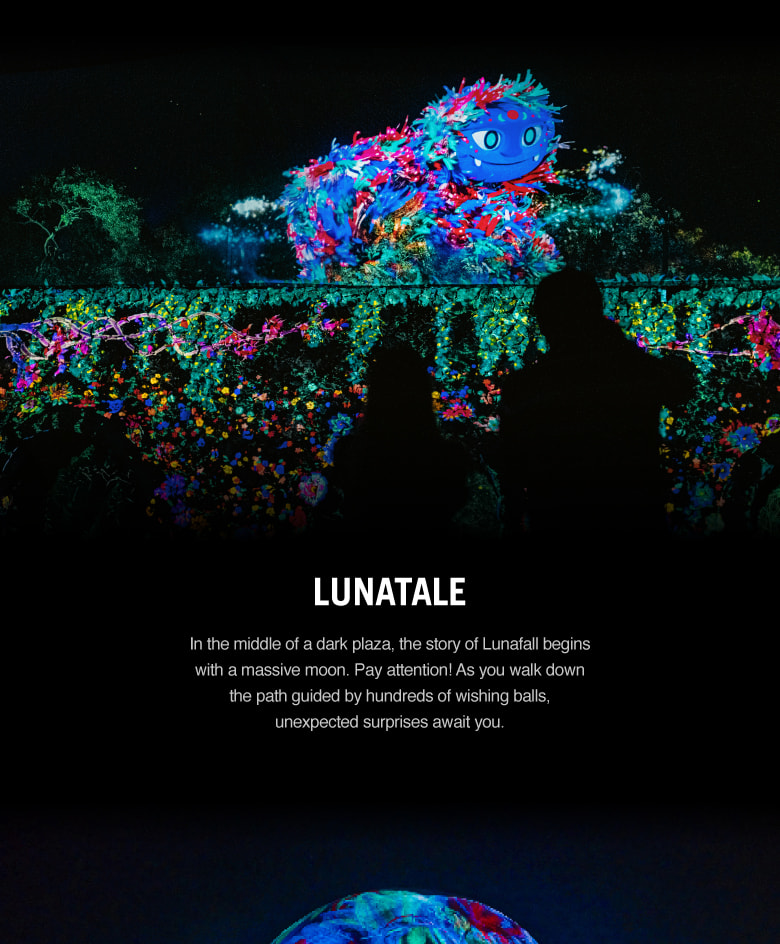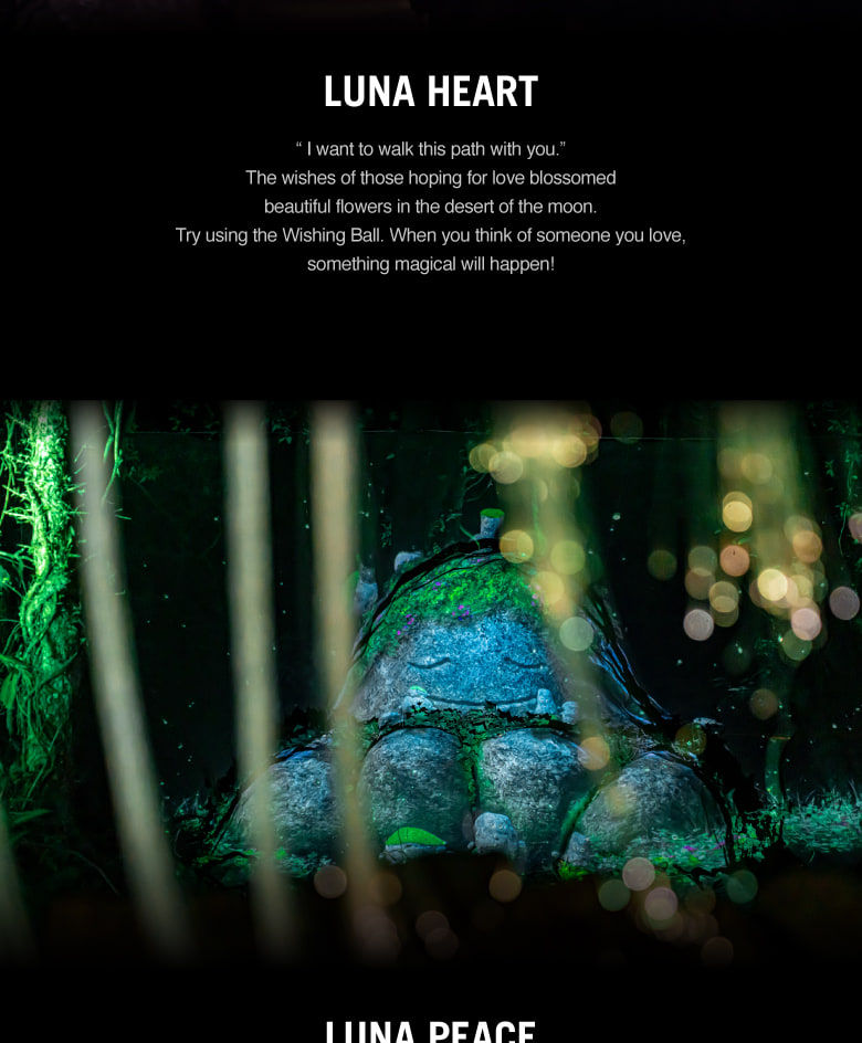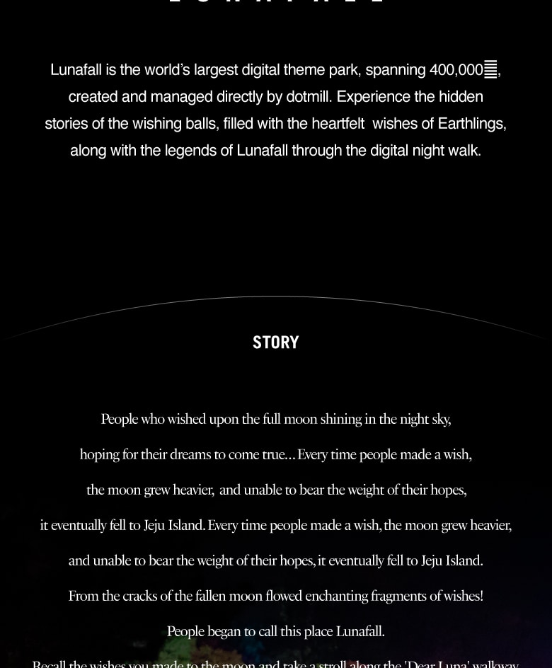 - Lunapole的故事背景是「人們長久以來向月亮許願,而月亮因承載著這些願望而墜落於濟州 (Jeju)」,因此擁有獨特且豐富的世界觀,可增強沉浸感。在這裡,遊客可以享受漫步於濟州 (Jeju) 夜間小徑的特別體驗,感受Lunafall獨特世界與島上原始自然風光和尖端沉浸式媒體技術的完美結合。