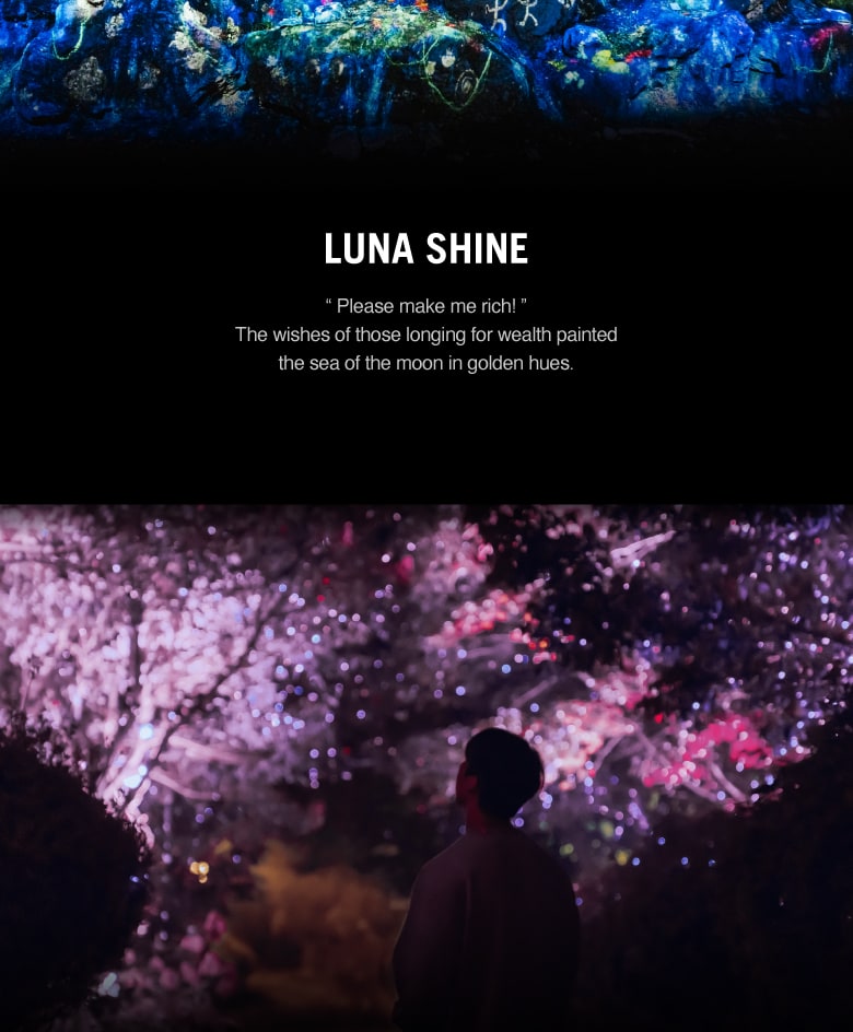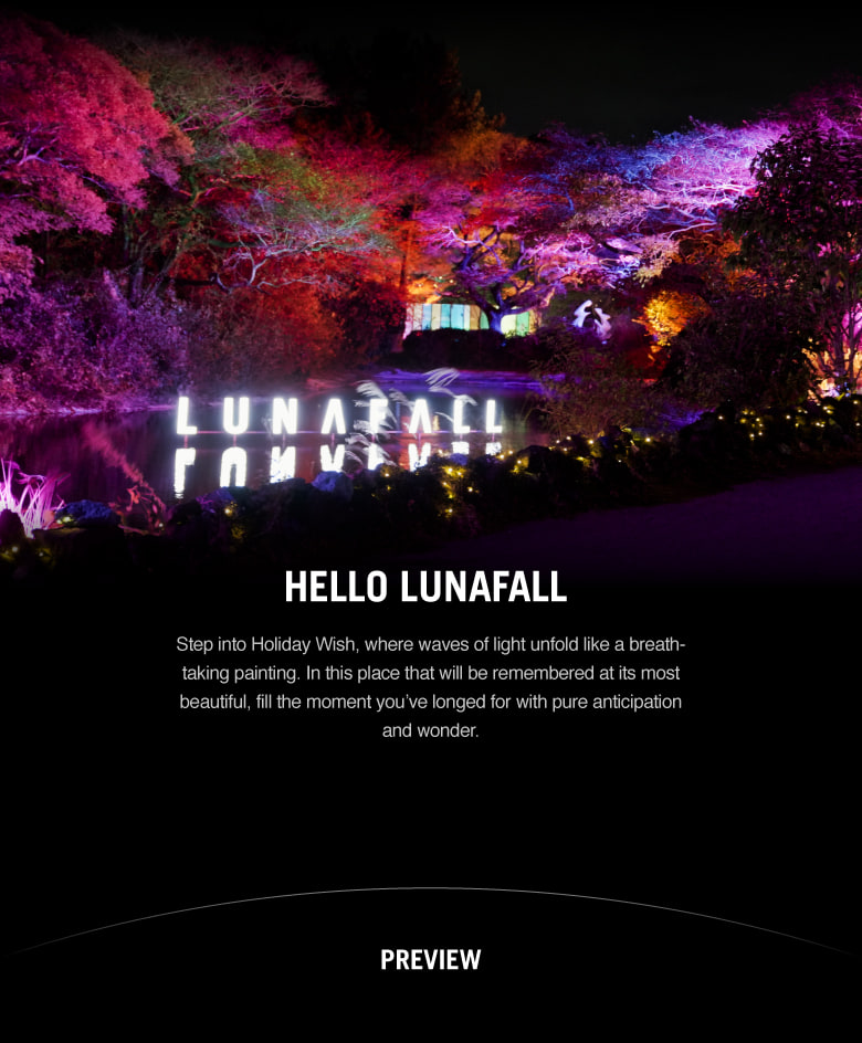 - Lunafall是個主題樂園,以墜落於濟州島的月亮和願望碎片為主題,讓您沉浸式體驗濟州 (Jeju) 美麗的夜晚和奇幻的媒體藝術。