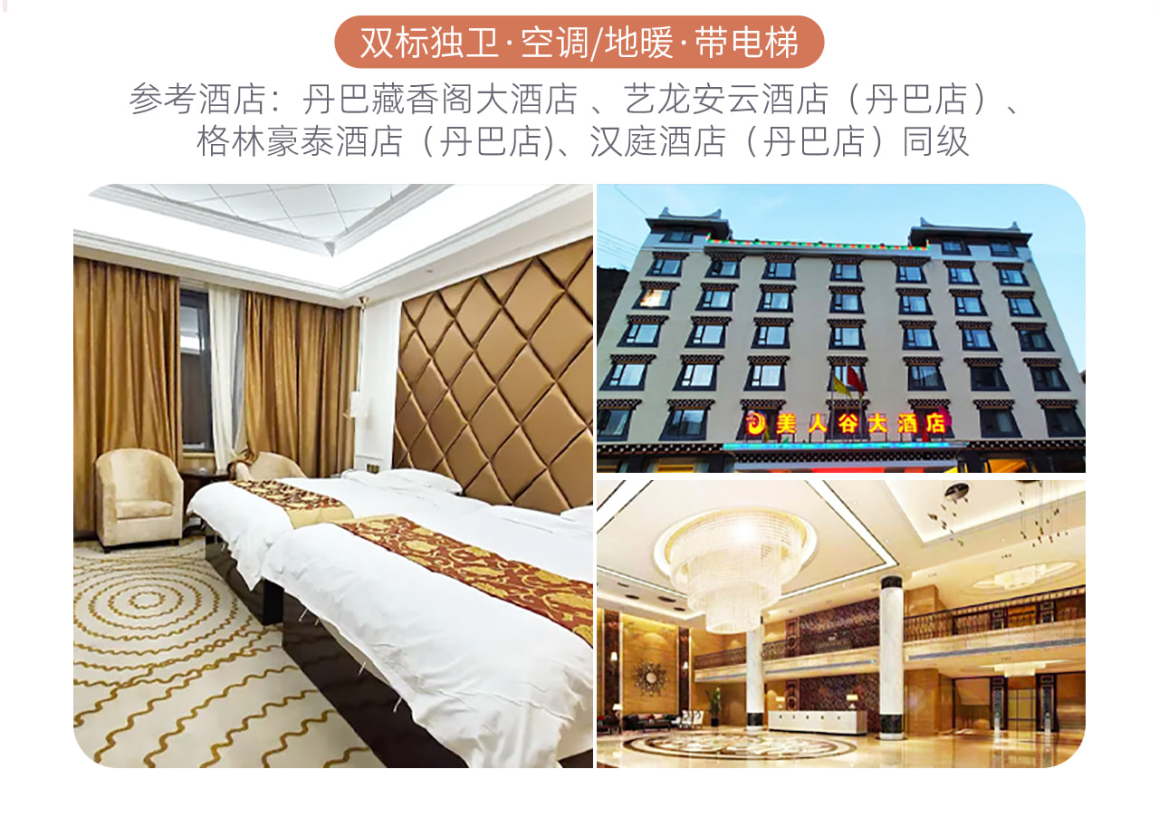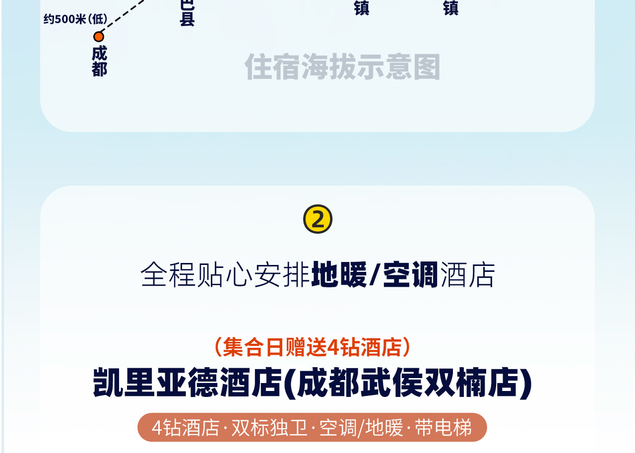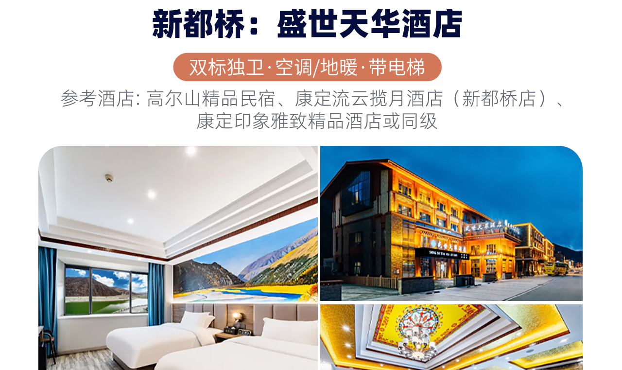 - [住宿升級] 全程飯店均帶地暖/空調,成都升級4鑽飯店,稻城亞丁住低海拔地區,睡好才能玩好。