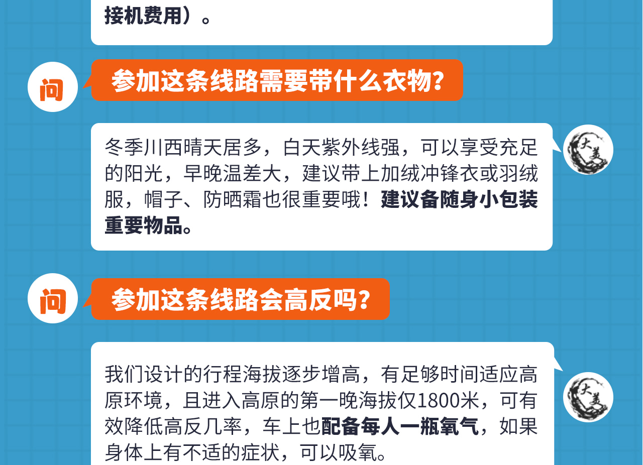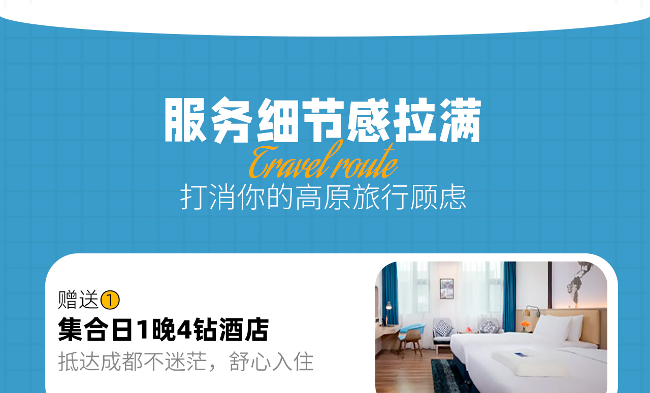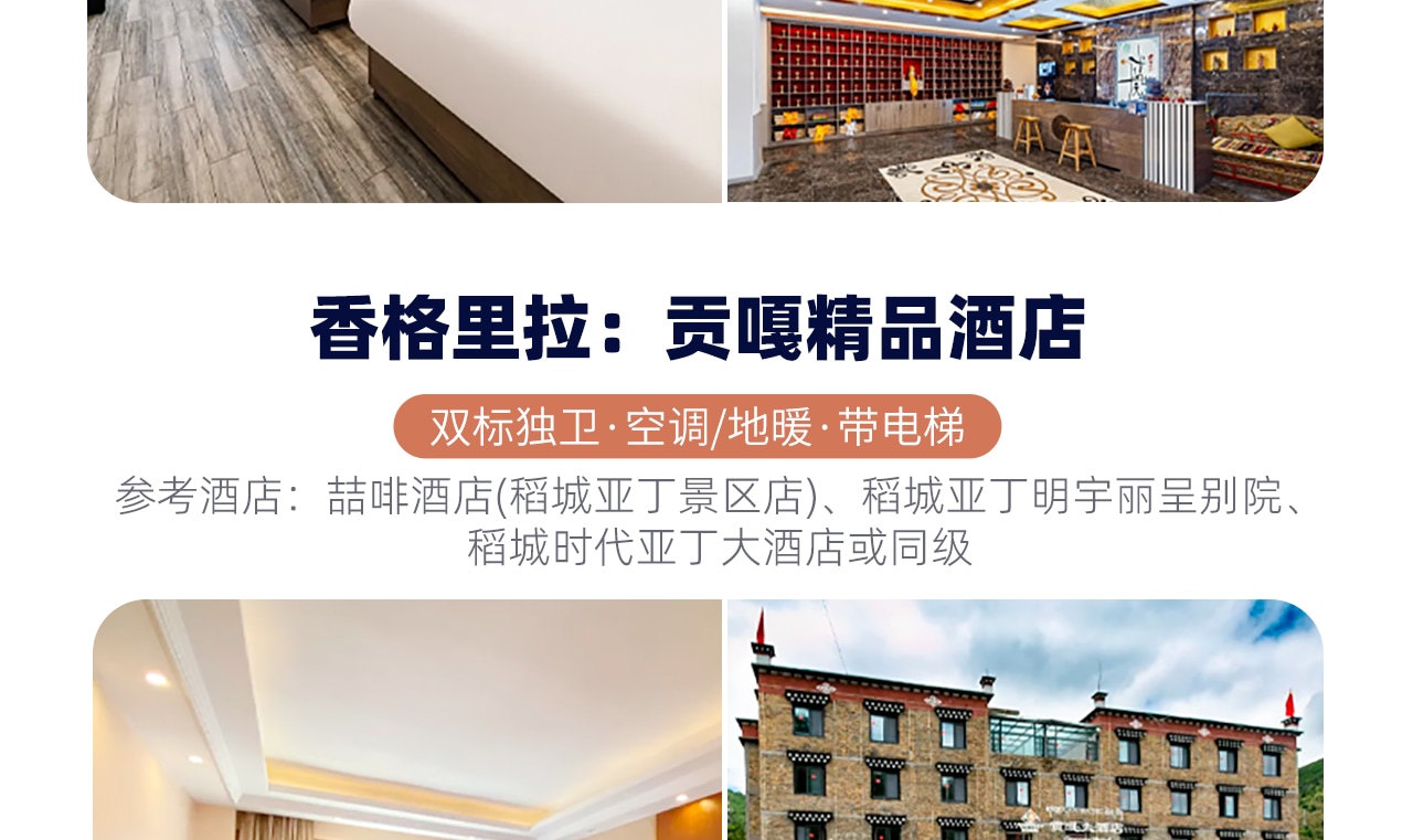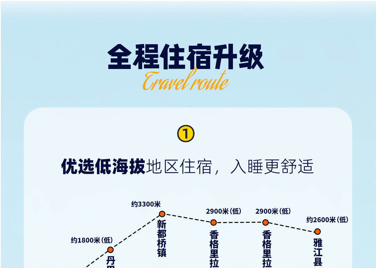 - [住宿升級] 全程飯店均帶地暖/空調,成都升級4鑽飯店,稻城亞丁住低海拔地區,睡好才能玩好。