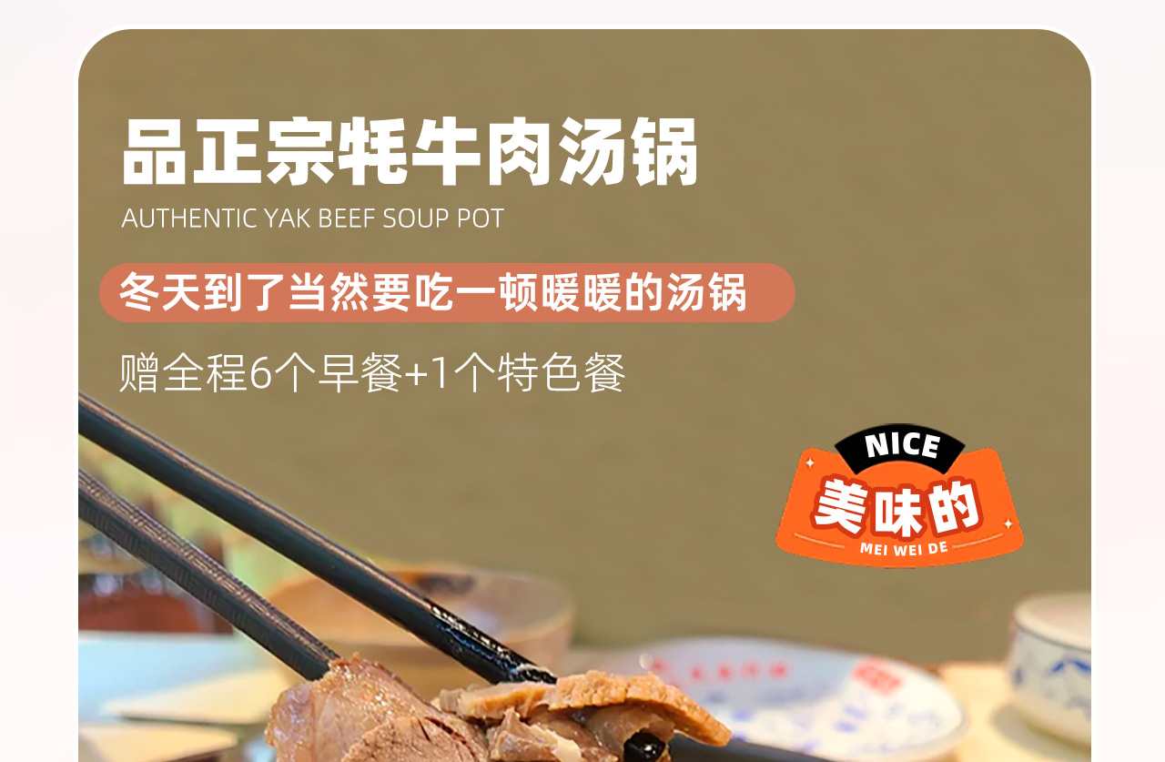 - [贈6早+1個特色餐] 含全程6個早餐,品正宗犛牛肉湯鍋。