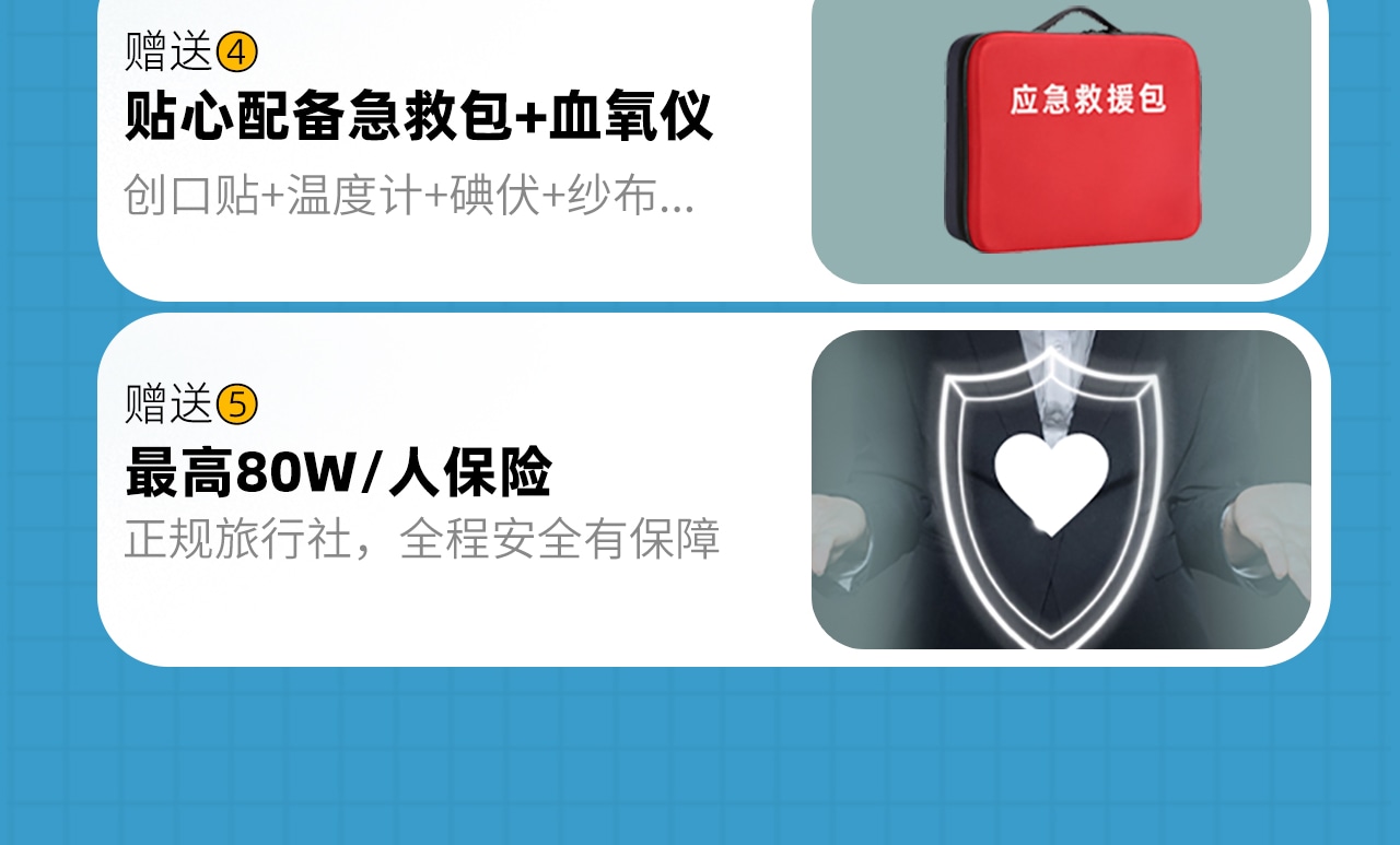 - [服務升級] 隨團配血氧飽和儀+體溫計+急救包,隨時觀察瞭解您的身體狀況。