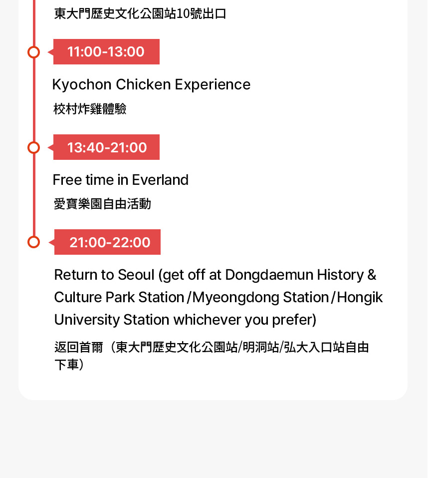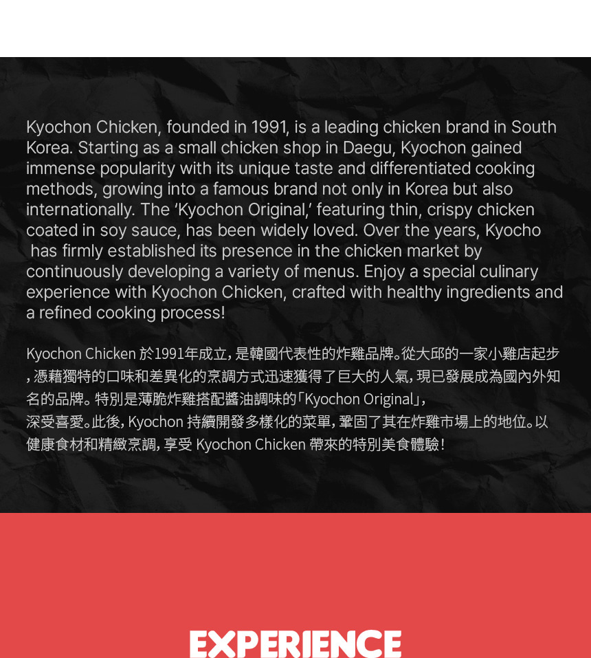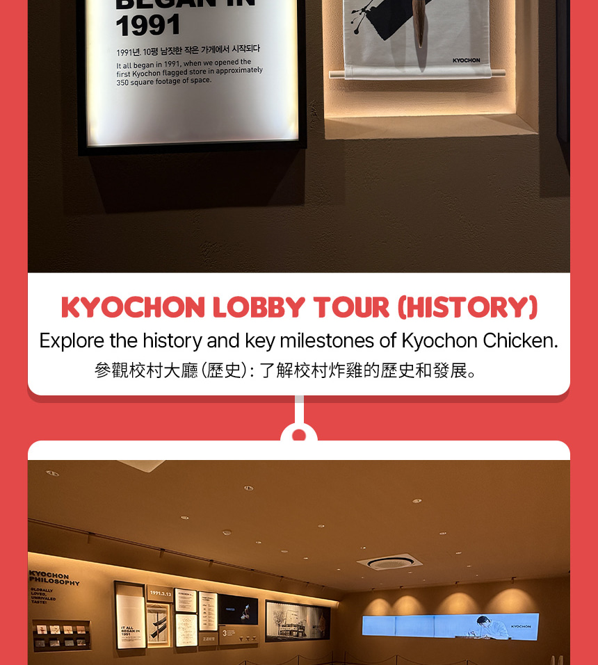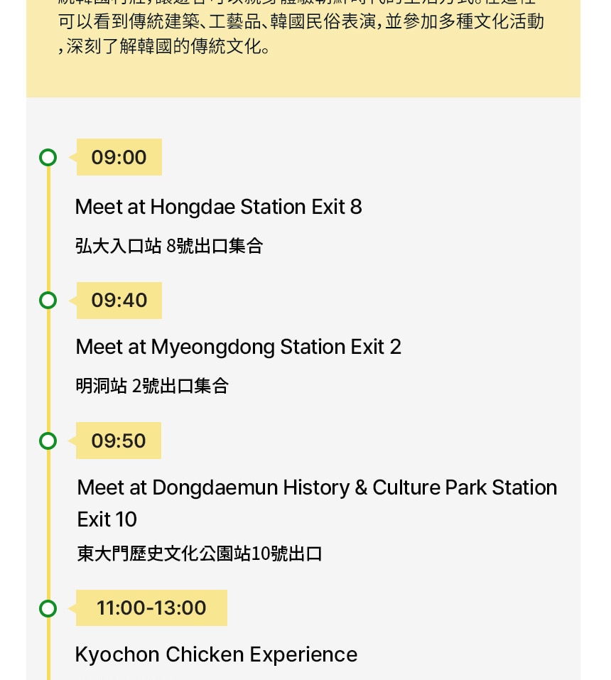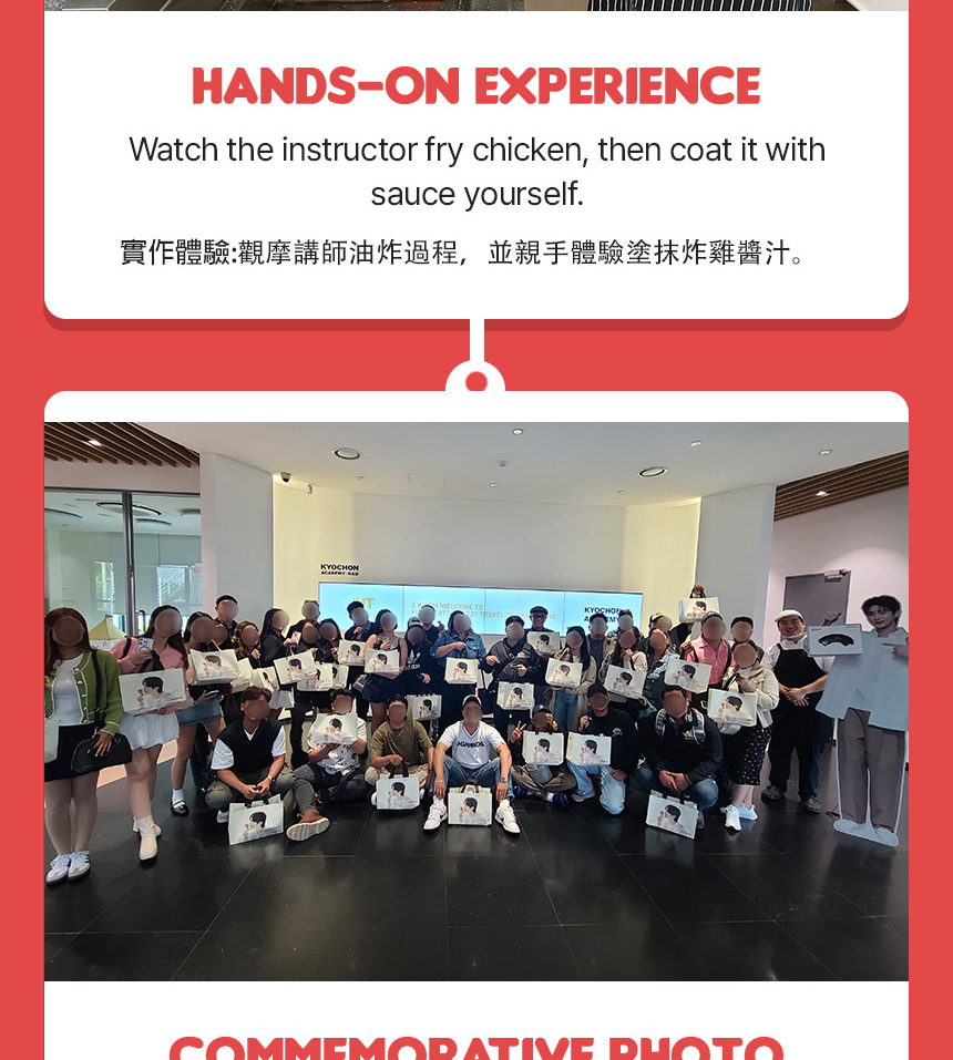 透過在 Kyochon Chicken 總部的品牌體驗,深入探索韓國第一炸雞品牌。此行程將帶您了解 Kyochon 的品牌理念、品質標準,以及它如何從在地人氣美食躍升為全球知名品牌。參與者將享有專業導覽的品牌介紹、互動式醬料體驗,以及品嚐 Kyochon 獨家風味的炸雞。這趟旅程著重於品牌故事、風味探索與品嚐,提供引人入勝且輕鬆愉快的參觀體驗。總部參觀結束後,您將繼續前往精選景點,將韓國美食文化與熱門觀光體驗完美結合。