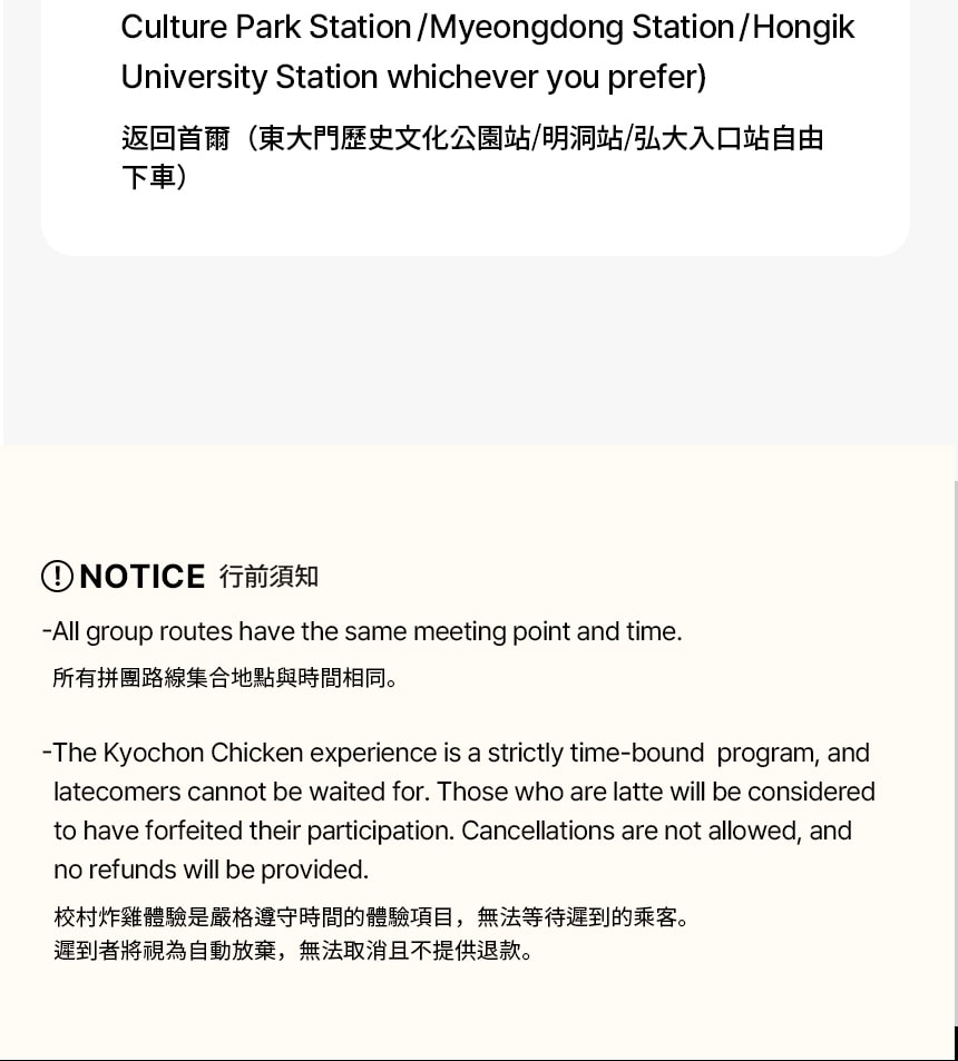 - 為維護公平性,行程將準時出發,恕不個別提醒或等候。遲到者將不予退款,請務必準時抵達指定集合地點。