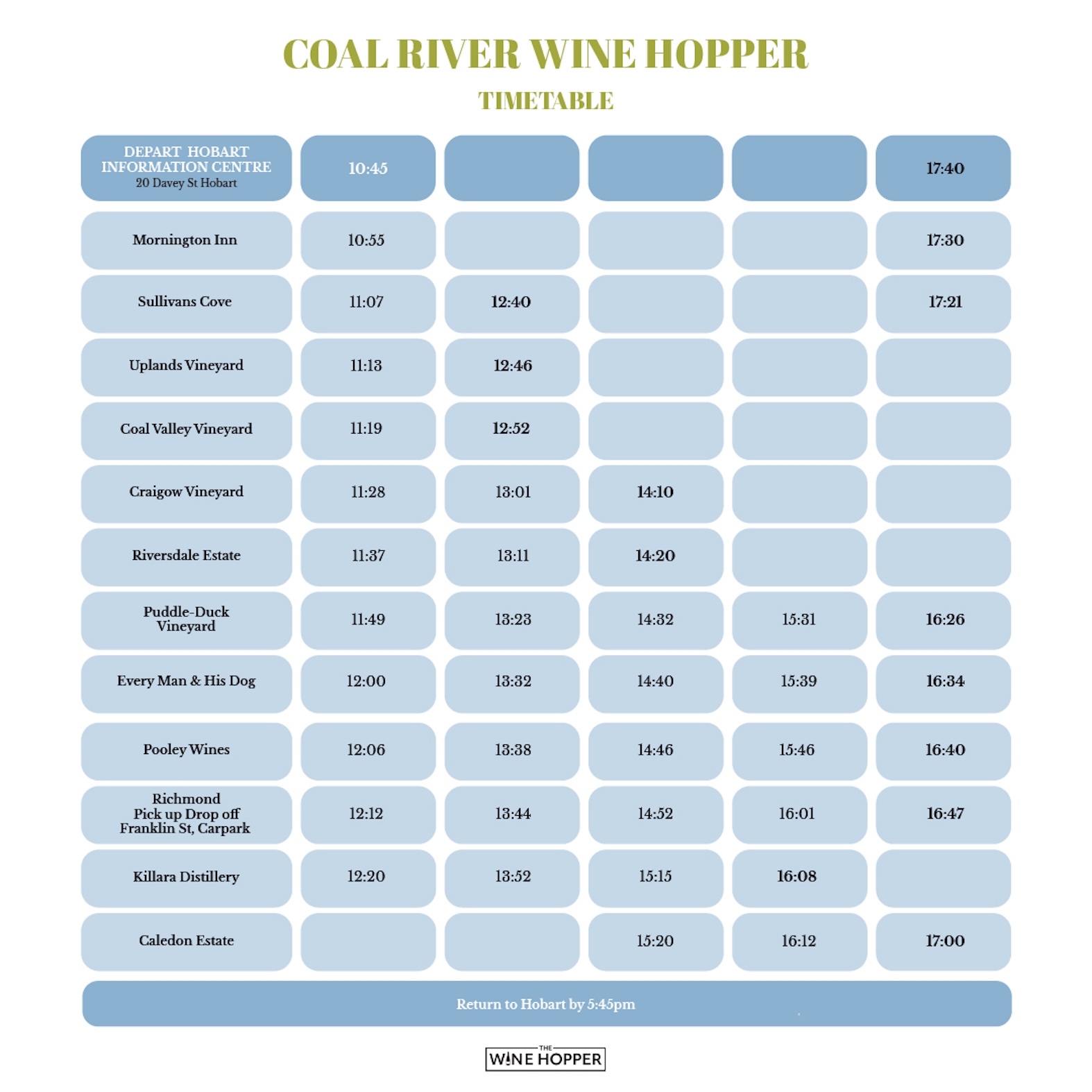 深入探索塔斯馬尼亞「煤河谷 (Coal River Valley)」七大頂級景點,除了品嚐美酒,還能在各站盡享在地農產品,完美展現該地區「美食之都」的美譽。盡情享受自由探索的樂趣,我們提供每小時接駁服務,並可彈性安排更長的停留時間,例如悠閒的 2 小時午餐時光。精心設計的行程確保您擁有無壓力的體驗,並在傍晚時分舒適返回荷巴特。我們的系統允許您全天共停留 3 至 4 個站點。為最大化您的體驗,我們建議您按照時刻表所示的順序參觀各場所,並提前預訂。