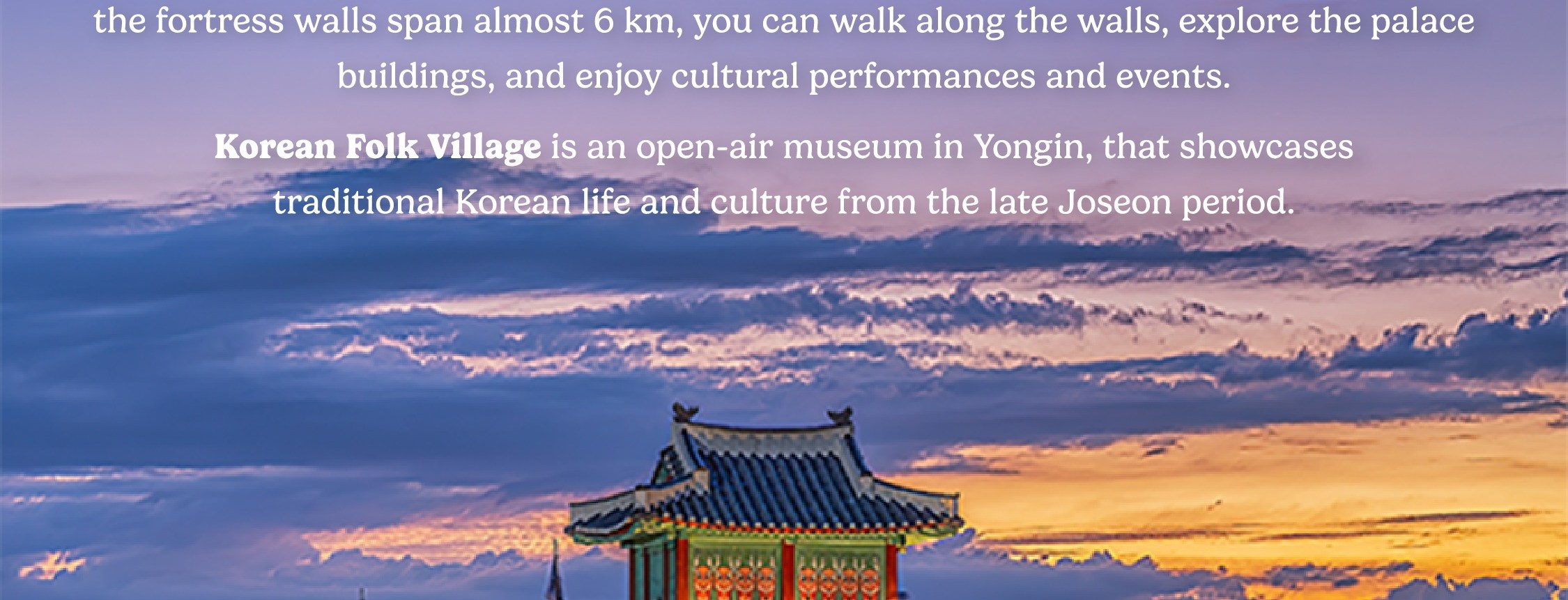 - 韓國民俗村 (Korean Folk Village):一座生動的博物館,展示傳統韓國生活和文化,提供沉浸式體驗。