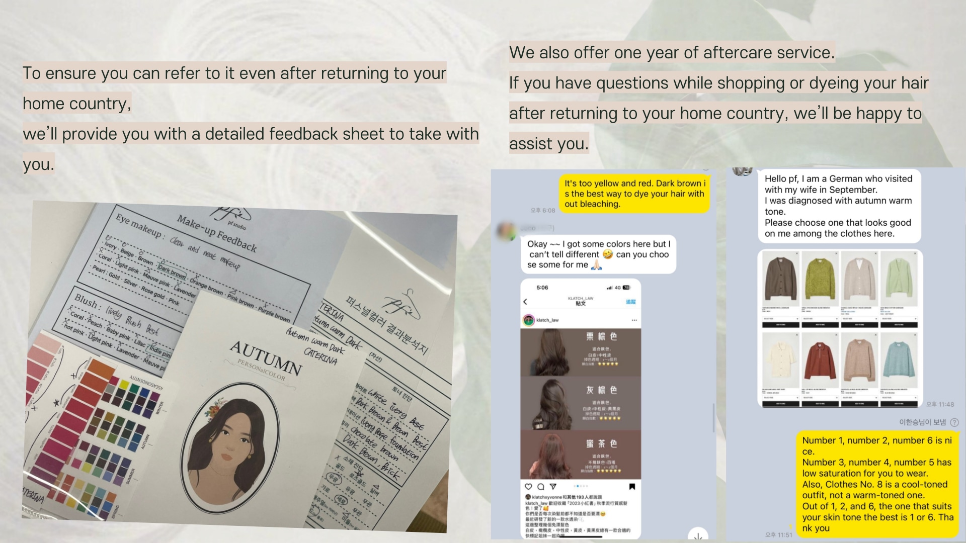 我們還提供後續服務。即使您旅行後返回您的國家,請給我們發送服裝顏色推薦、化妝品推薦等 dm,我們將根據我們記錄的客戶數據給您真誠的答覆。