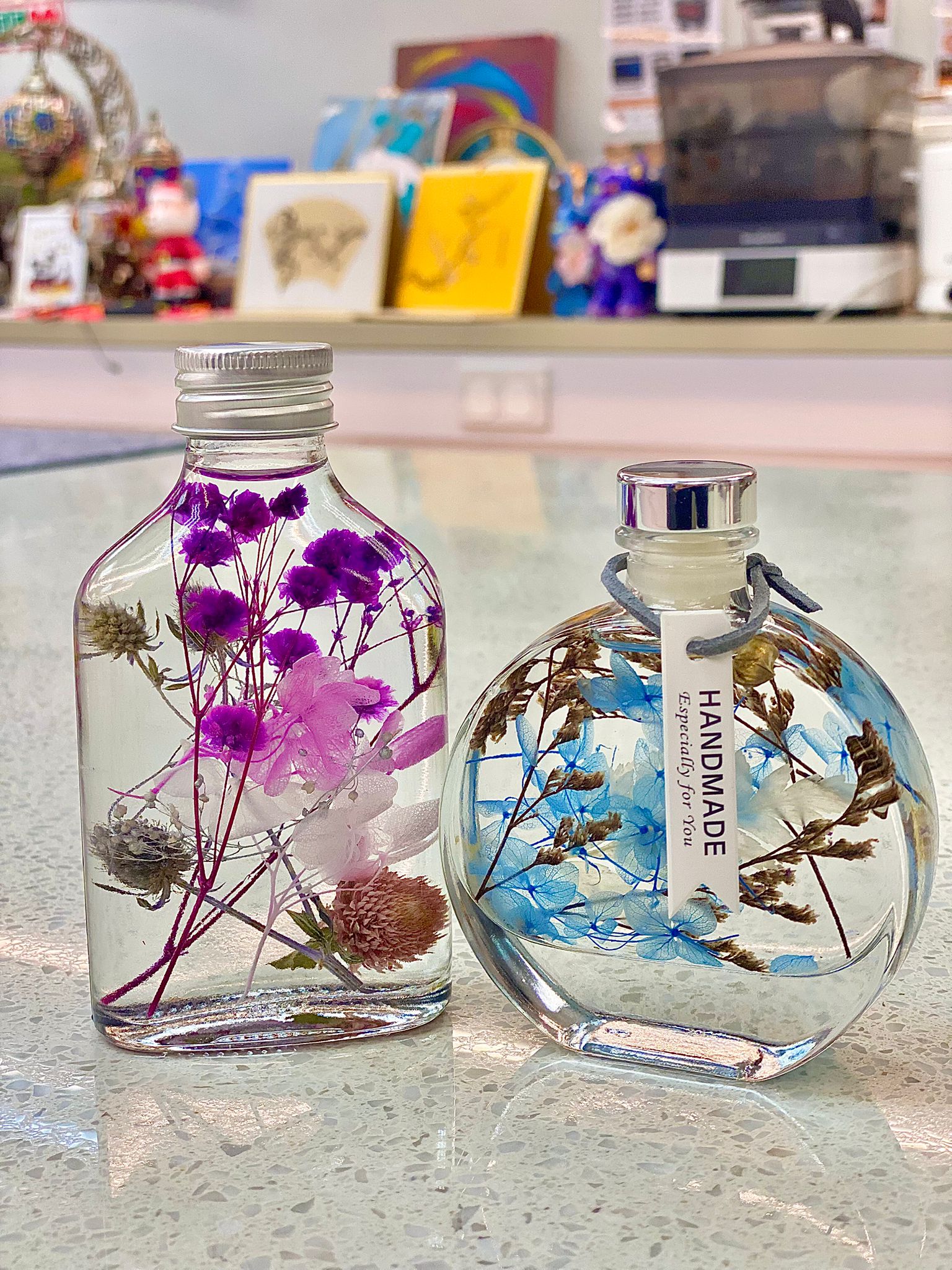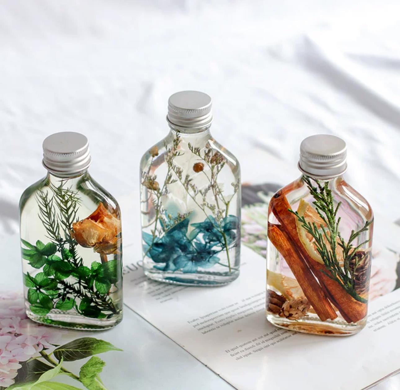 - 將永生花和乾燥花等素材放入玻璃瓶中,並注入專用的礦物油,使花材在瓶中呈現出漂浮效果