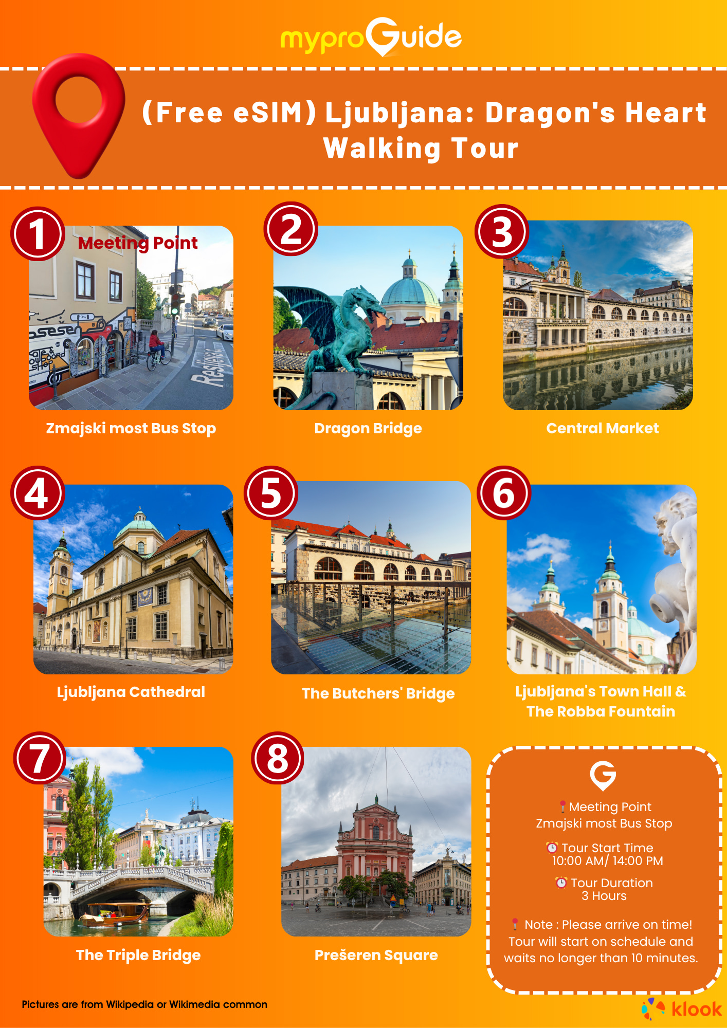 探索斯洛文尼亞迷人首都的魔力。我們的徒步之旅從傳奇的龍橋開始,帶您穿梭於城市充滿活力的中心地帶。穿過浪漫的三重橋,探索繁華的中央市場,沉浸在普列舍倫廣場的歷史氛圍中。包含免費eSIM,讓您隨時保持聯繫,分享每一個童話般的時刻。立即預訂您的盧布爾雅那之旅!