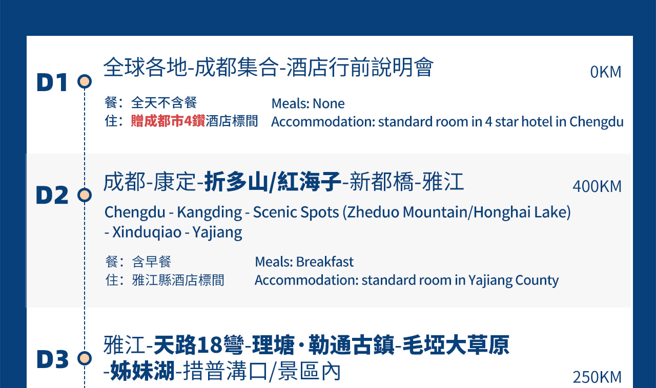 - 第2天:成都-康定-折多山/紅海子-新都橋-雅江(400KM,約7小時)
