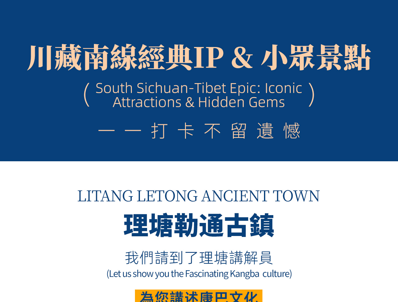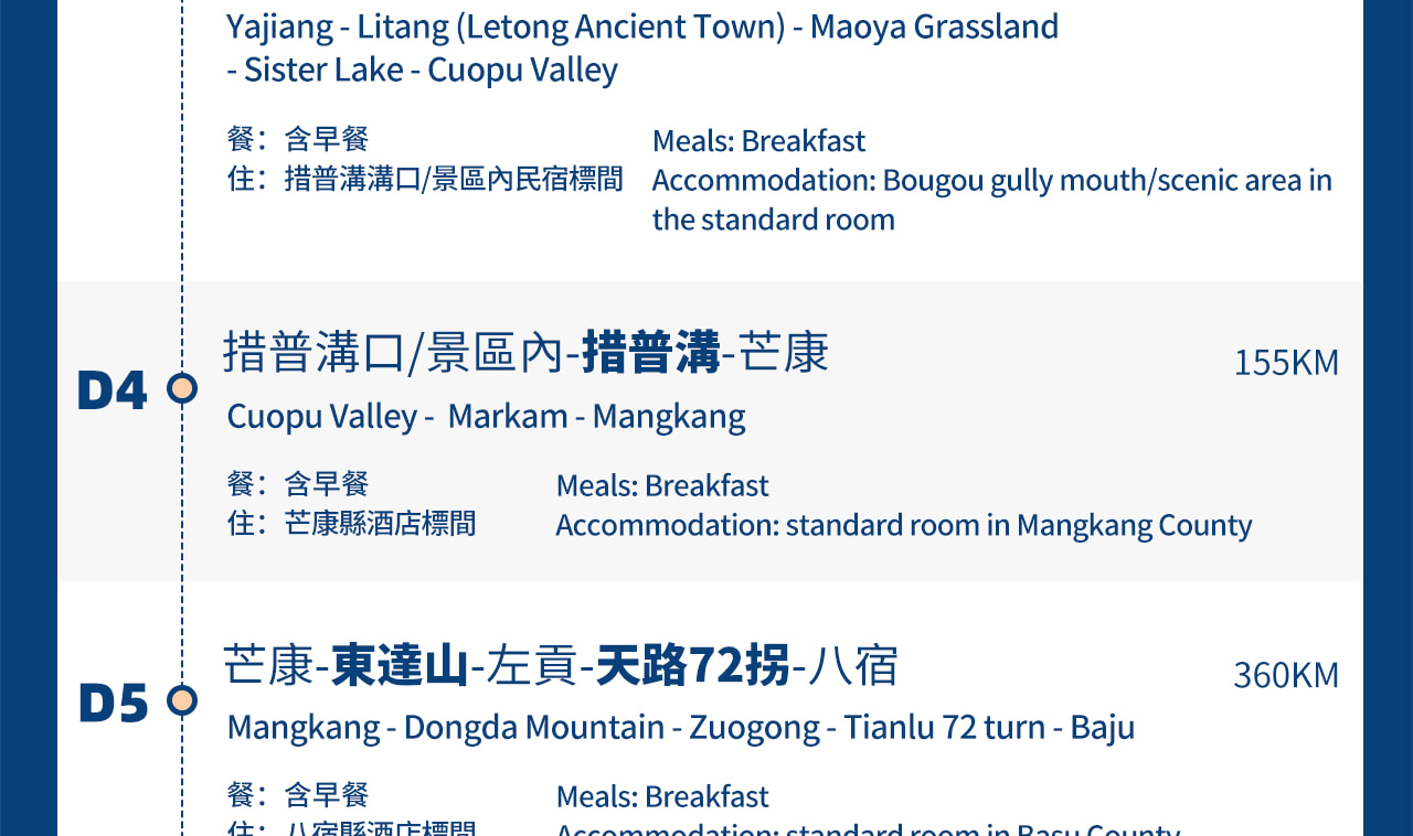 - 第3天:雅江-天路18彎-理塘·勒通古鎮-毛埡大草原-姊妹湖-措普溝口/景區內(250KM,約6小時)