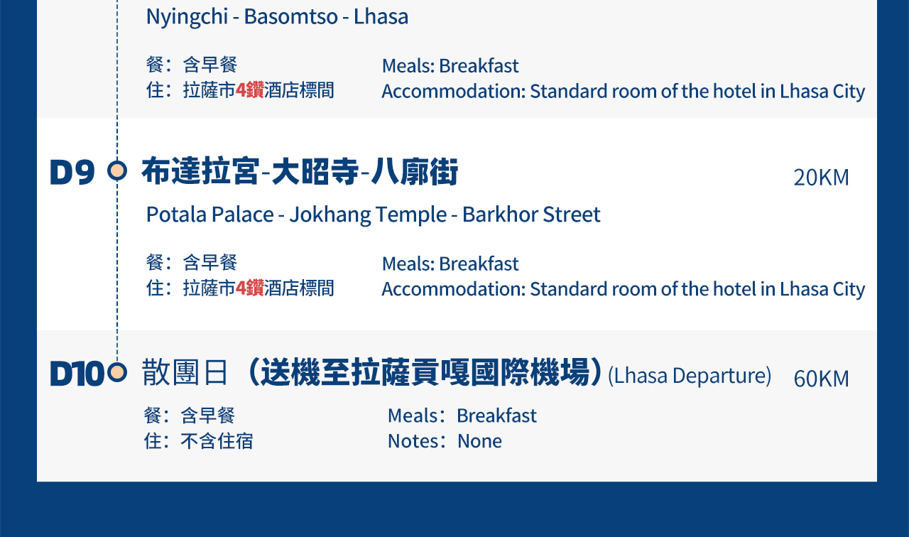 - 第10天:散團日(送機至拉薩貢嘎國際機場)(60KM,約1.5小時)